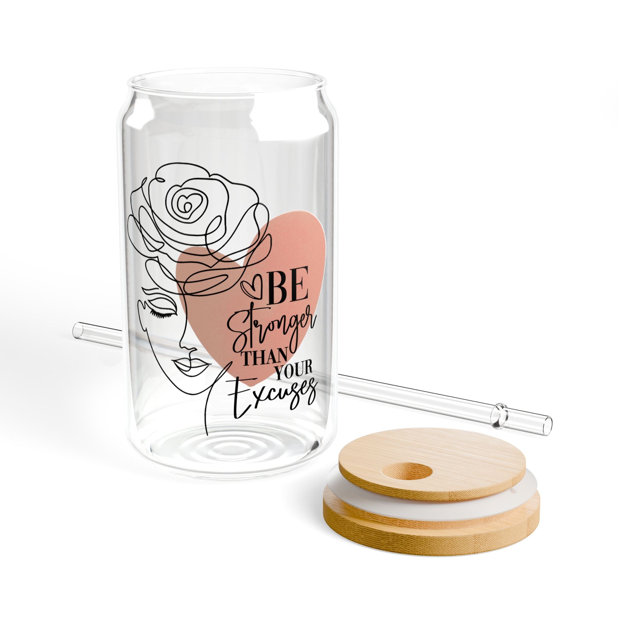 Be Stronger Than Your Excuses Inspirational Tumbler Sipper Glass 16oz — Reusable Drink Jar with Lid & Straw