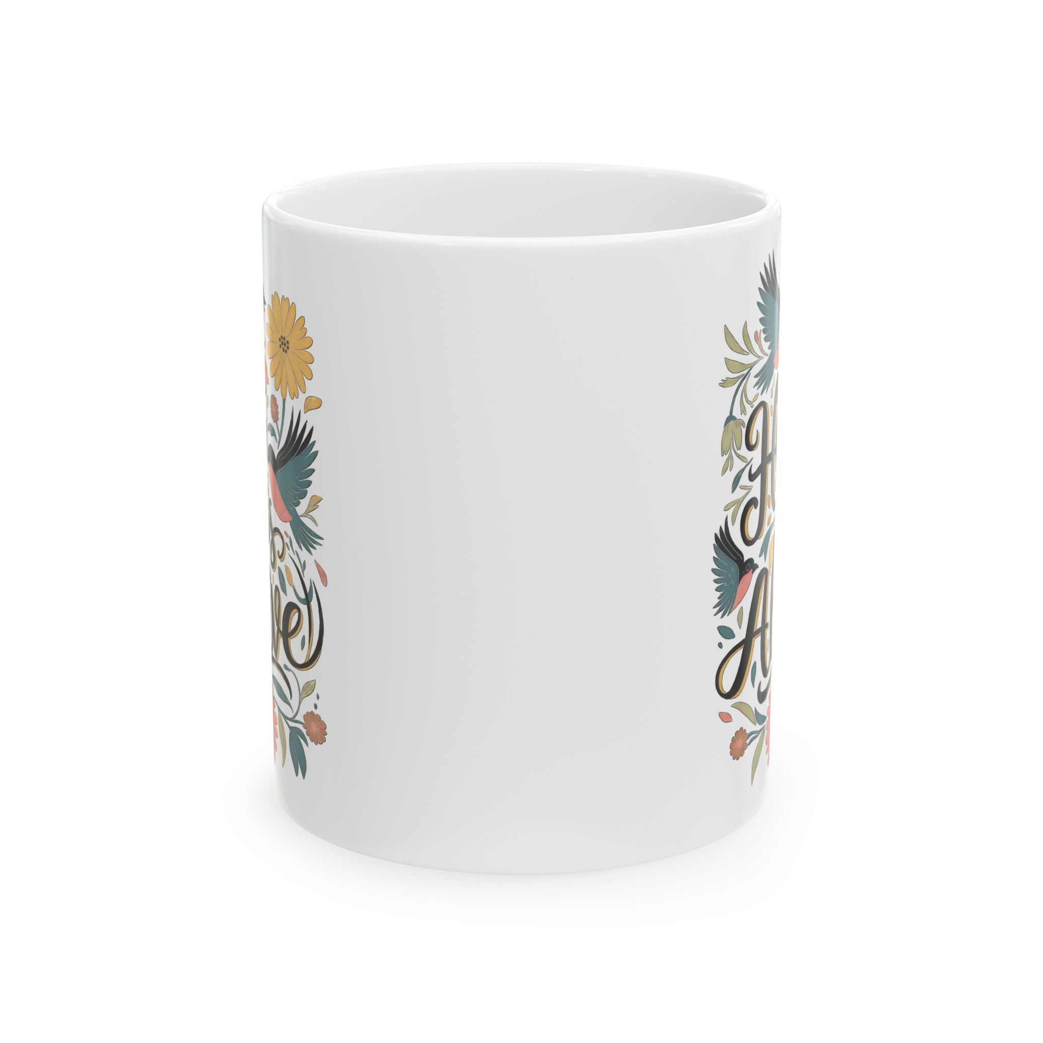 Bright mornings start with gentle color and a little bit of charm. This glossy ceramic mug carries a soft, hand-lettered phrase tucked into a loose bouquet of folk-inspired blooms. Hold it warm between both hands and feel the quiet, crafted energy of small moments: a slow sip, a note jotted in the kitchen, a phone call with a friend. The artwork reads like a page from a well-loved notebook — approachable, hopeful, and quietly stylish — making daily rituals feel thoughtful rather than rushed.