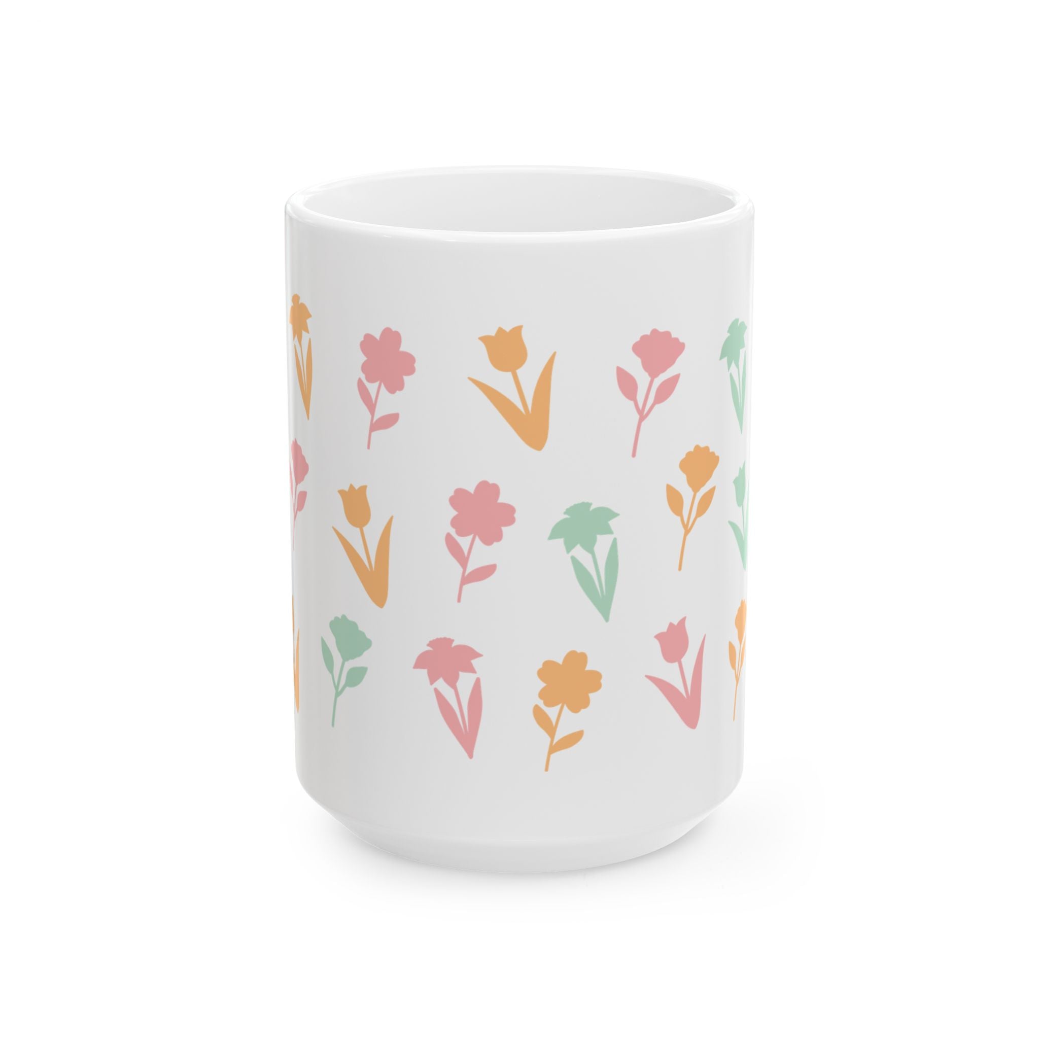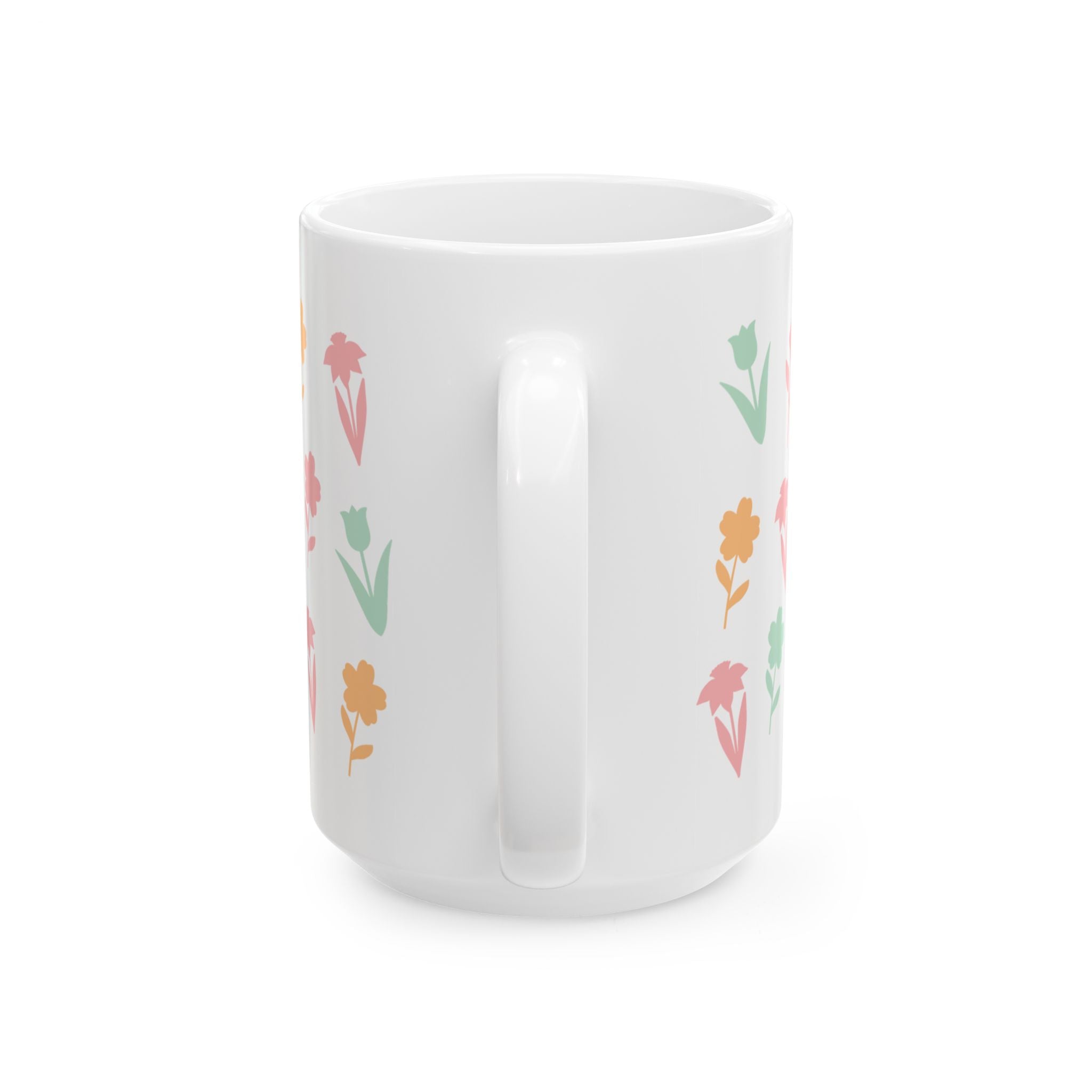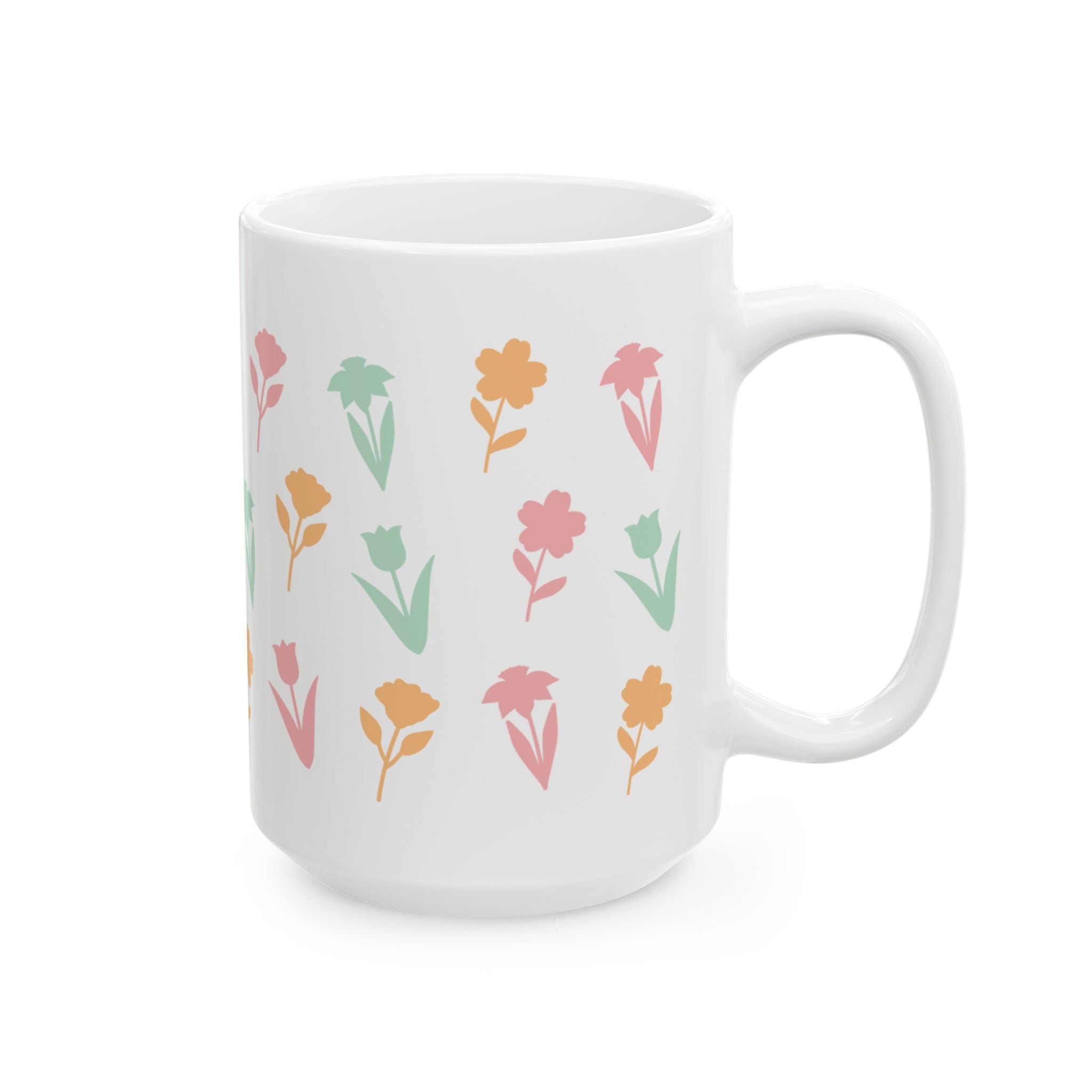 This glossy ceramic mug brings a quiet, joyful moment to morning routines. Soft, hand-drawn floral silhouettes in muted pinks, greens, and warm apricot wrap the white surface, giving a gentle, vintage-inspired look without shouting for attention. It feels like a slow spring morning — sunlight through curtains, steam rising from a fresh cup. Easy to hold by the comfortable C-handle, and available in two sensible sizes, this mug fits into everyday life: sipping tea at the kitchen table, settling into a reading nook, or carrying to a sunlit desk. Durable, bright printing keeps the colors cheerful wash after wash, so the little floral pattern becomes a familiar comfort rather than a fleeting accent.
