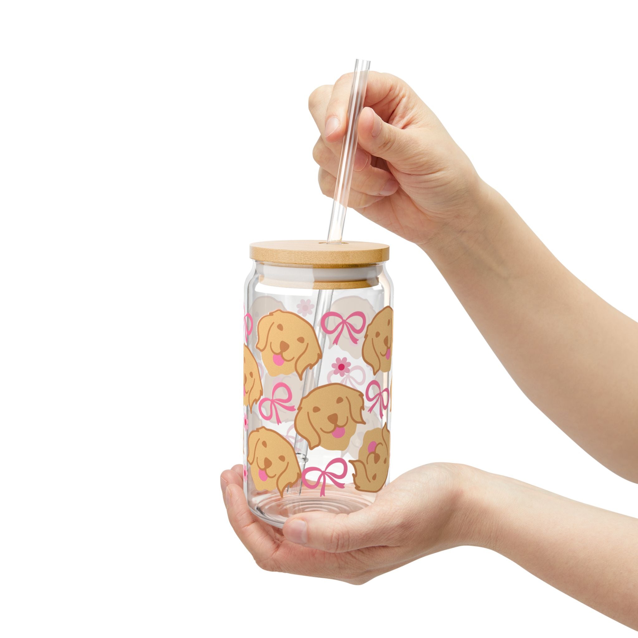 Hold your favorite cold drink in a glass that feels like a little celebration. This 16oz sipper glass blends clear tempered glass with a playful pattern of golden retriever faces, pink bows, and tiny flowers. It brings a warm, lighthearted energy to desk breaks, garden mornings, or slow afternoons on the porch. Choose the bamboo push lid with a clear Tritan straw for spill-minimizing sipping on the go, or skip the lid for a simple, open-top cup. The colors stay bright thanks to modern printing, and the BPA-free Tritan straw resists dents and temperature changes. Hand wash gently to keep the design looking fresh.