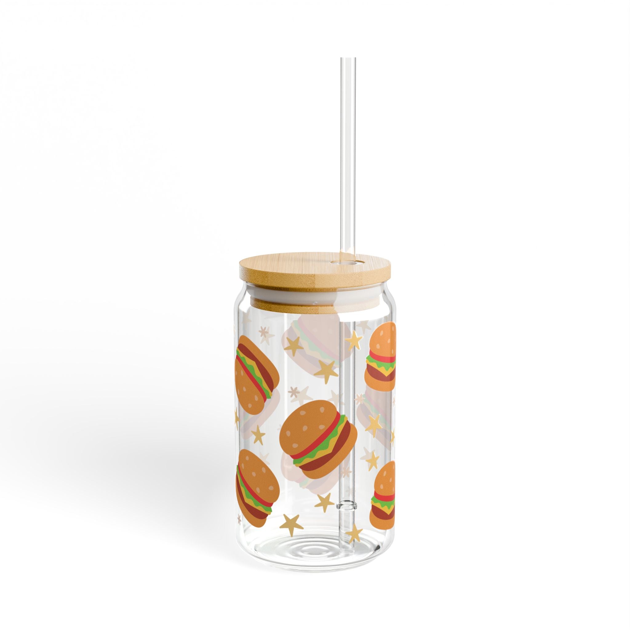 Burgers Tumbler Sipper Glass 16oz — Reusable Drink Jar with Lid & Straw