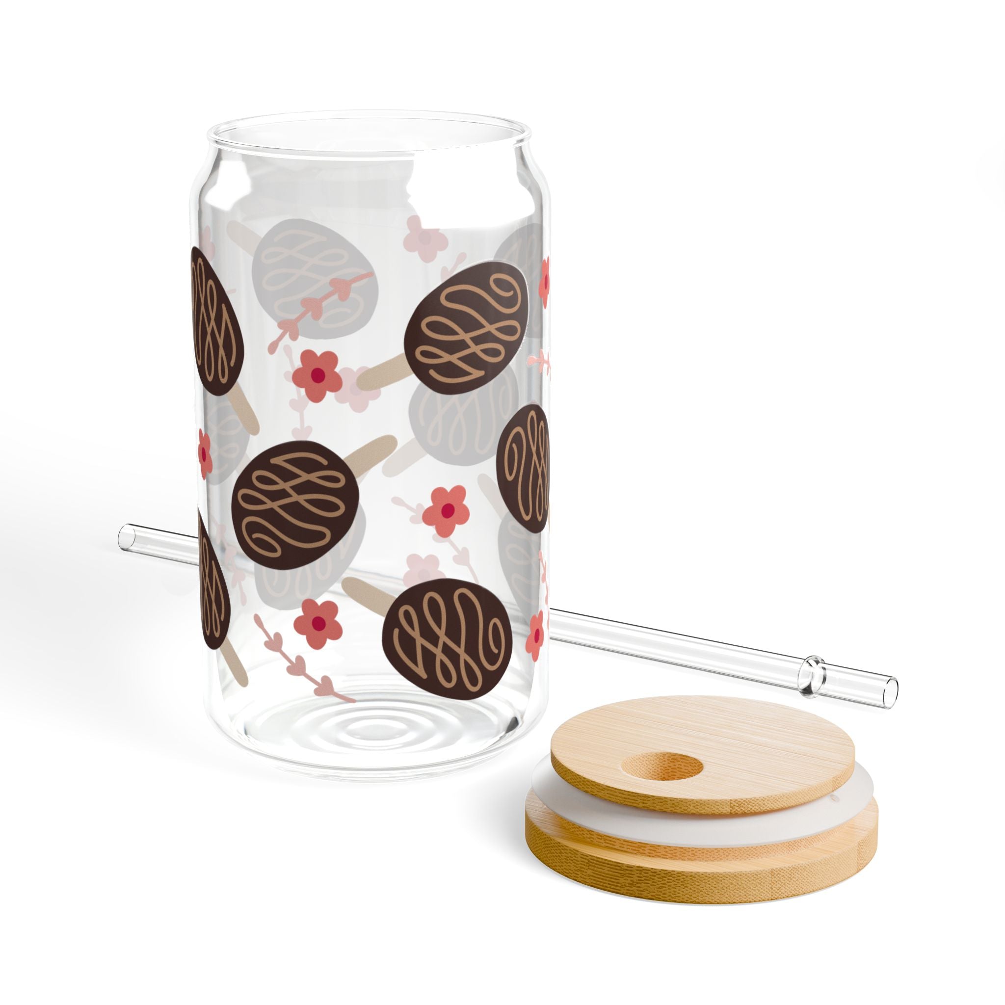Sip slow and smile—this 16oz sipper glass brings playful charm to everyday drinks. The clear tempered glass shows off a repeating pattern of chocolatey cookie circles and tiny pink blooms, a sweet little scene that feels cozy and whimsical. Choose the bamboo gasket-push lid and clear Tritan straw to keep drinks covered and spill-resistant while adding a warm, natural accent. Lightweight and BPA-free, it sits easily on a desk, countertop, or picnic blanket and cleans up with a gentle hand wash. Made in the USA from globally sourced materials, it’s built to keep colors bright and designs crisp so that your favorite cold beverages look as good as they taste.