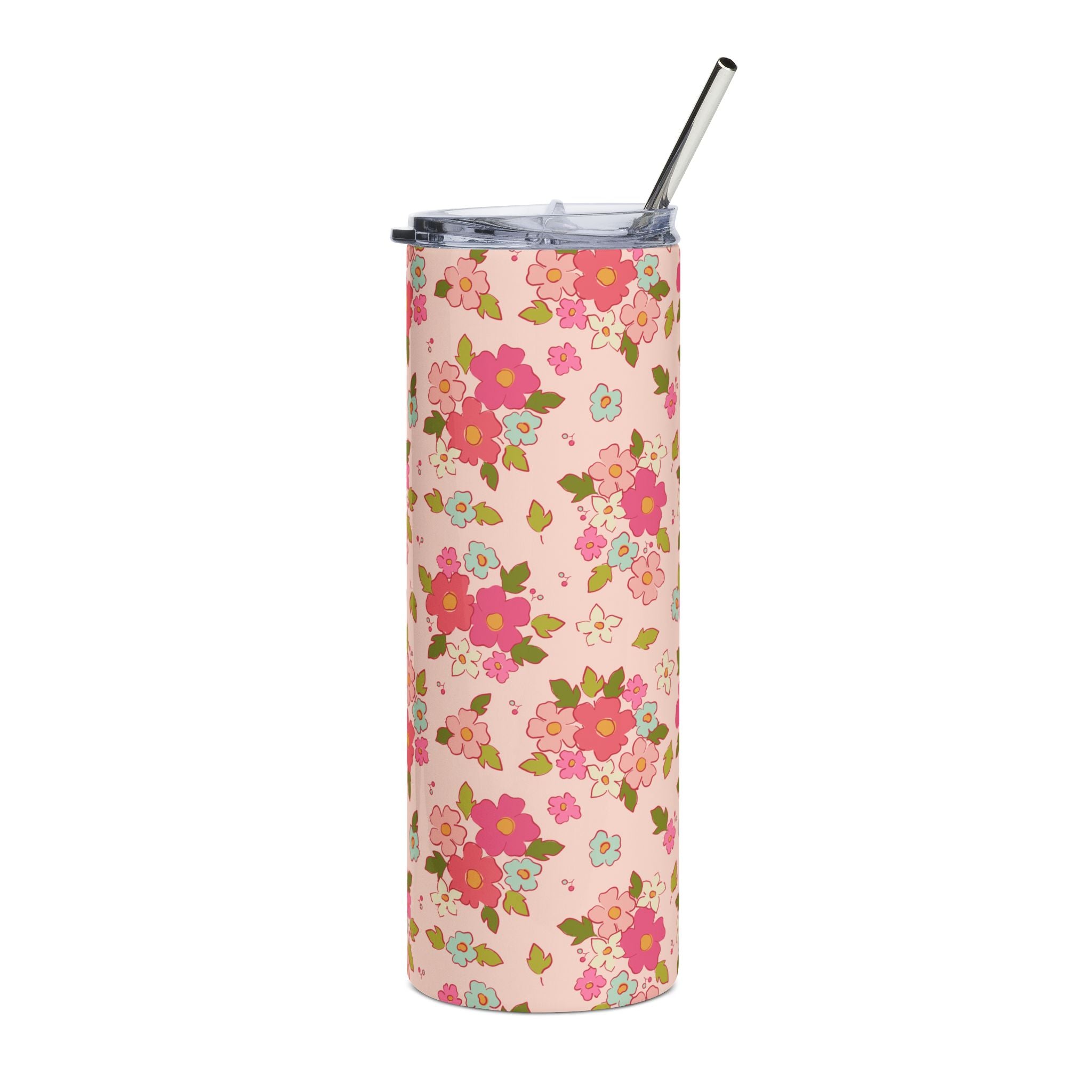 This slim 20 oz stainless steel tumbler brings soft, vintage-inspired florals to everyday sipping. Lightweight yet sturdy, its cylindrical 360° printable body is wrapped in a warm blush background dotted with hand-drawn pink and coral blossoms and tiny olive-green leaves. The glossy protective varnish brightens the colors and keeps the surface smooth, while the included clear lid and stainless straw make it easy to sip on the go. It slips into narrow cup holders and carries a calming, cottage-core vibe — for slow mornings, desk-side refreshment, and long walks with a coffee in hand.