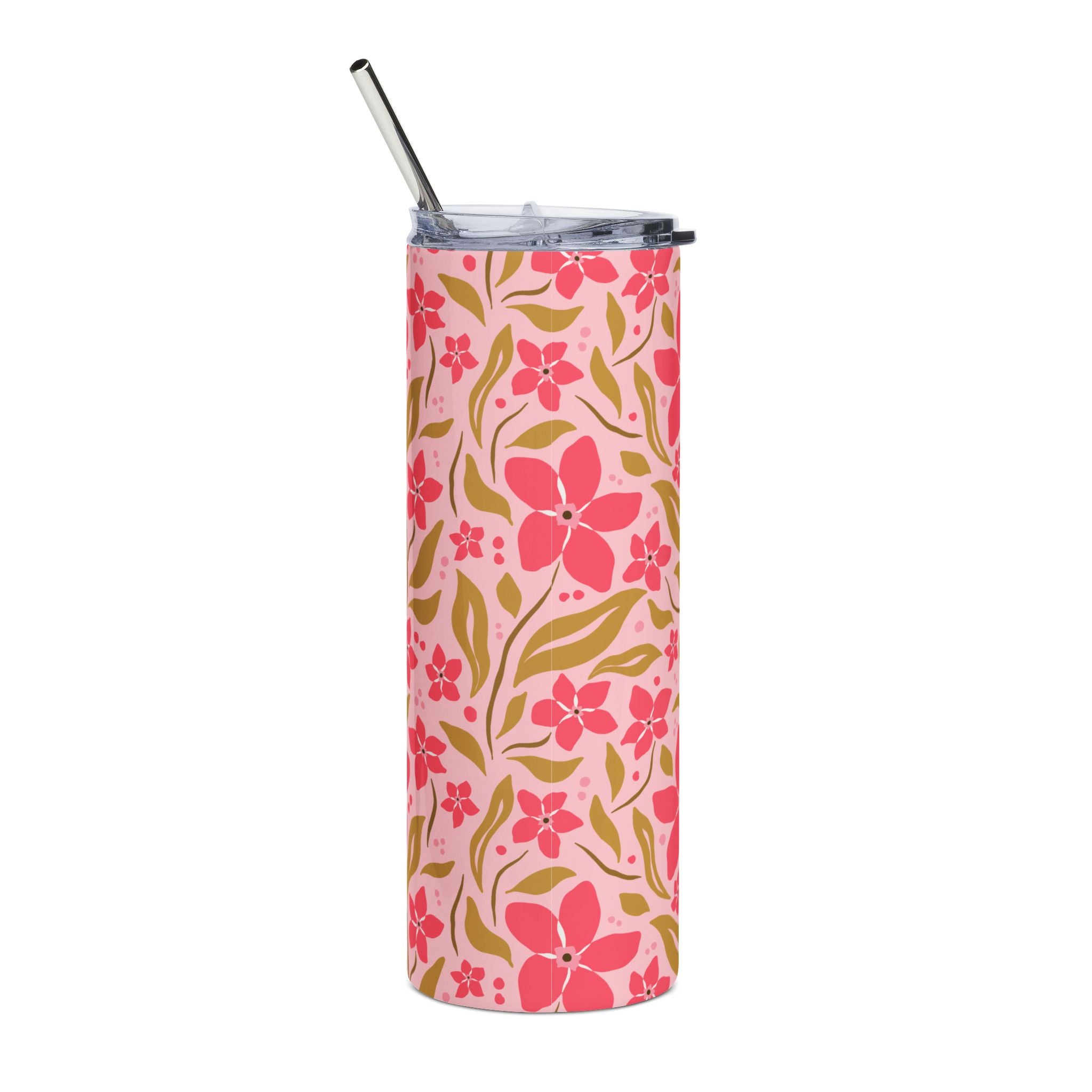This slim 20 oz stainless steel tumbler brings bright, hand-drawn floral energy to everyday sips. Lightweight and cylindrical with a full-wrap printable surface, it holds 600 ml of your morning coffee, iced tea, or chilled water while keeping a cheerful, vintage-inspired pattern on show. The glossy protective layer deepens the pink and coral tones and preserves the artwork. A clear lid and reusable straw make it easy to drink from on the go, and the narrow profile slips into car cup holders and tote pockets. It’s designed for someone who loves color, florals, and a little nostalgic charm in their daily routine.