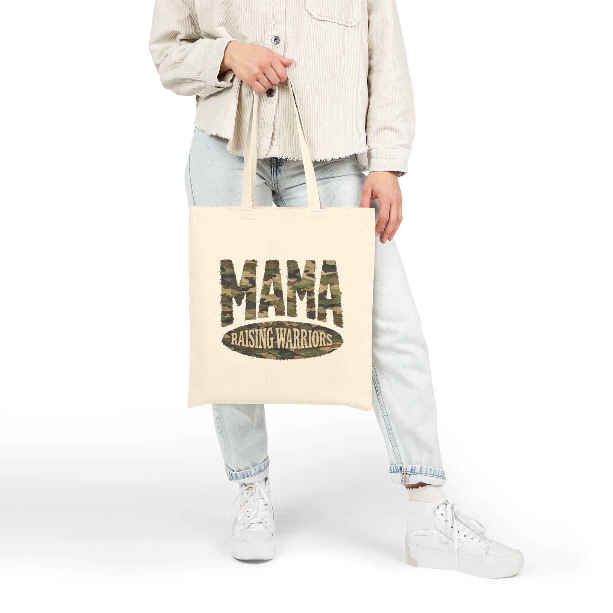 Canvas tote with quiet strength — a roomy, structured carryall that reads like a badge of honor. The design shows bold, camouflage-style lettering that says “MAMA” with “RAISING WARRIORS” beneath, giving it a proud, grounded voice without shouting. The heavy 12 oz cotton canvas feels substantial in hand and keeps the bag square and neat on the shoulder. Reinforced self-fabric handles + sewn-in label mean it’s made to last through grocery runs, practices, and park mornings. Natural or black colorways keep the look versatile and easy to pair with everyday outfits. This bag settles into the rhythm of family life—sturdy, honest, and quietly proud.