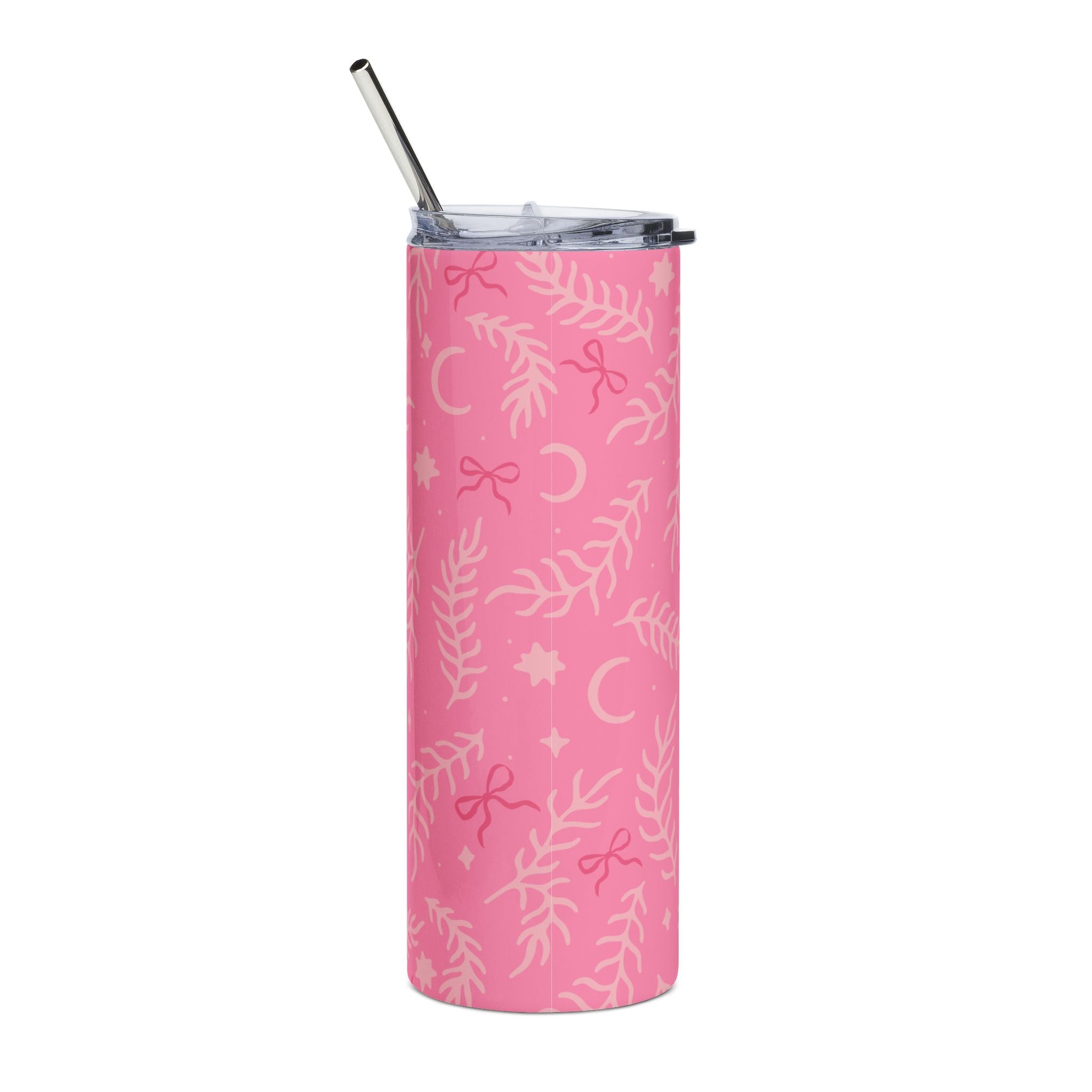 Sip with a soft, comforting touch. This 20 oz stainless steel tumbler wraps your drink in a smooth pink pattern of delicate sprigs, tiny bows and gentle crescent accents—quiet, feminine, and unfussy. The slender, cylindrical shape slips easily into a bag or cup holder. Double-walled stainless steel keeps drinks at the right temperature while the included clear lid and metal straw make it easy to drink on the go. The glossy protective layer gives the artwork a subtle sheen without shouting for attention. For someone who favors calm palettes, small details, and everyday elegance, this tumbler quietly earns a spot in morning routines, desk setups, and weekend walks.