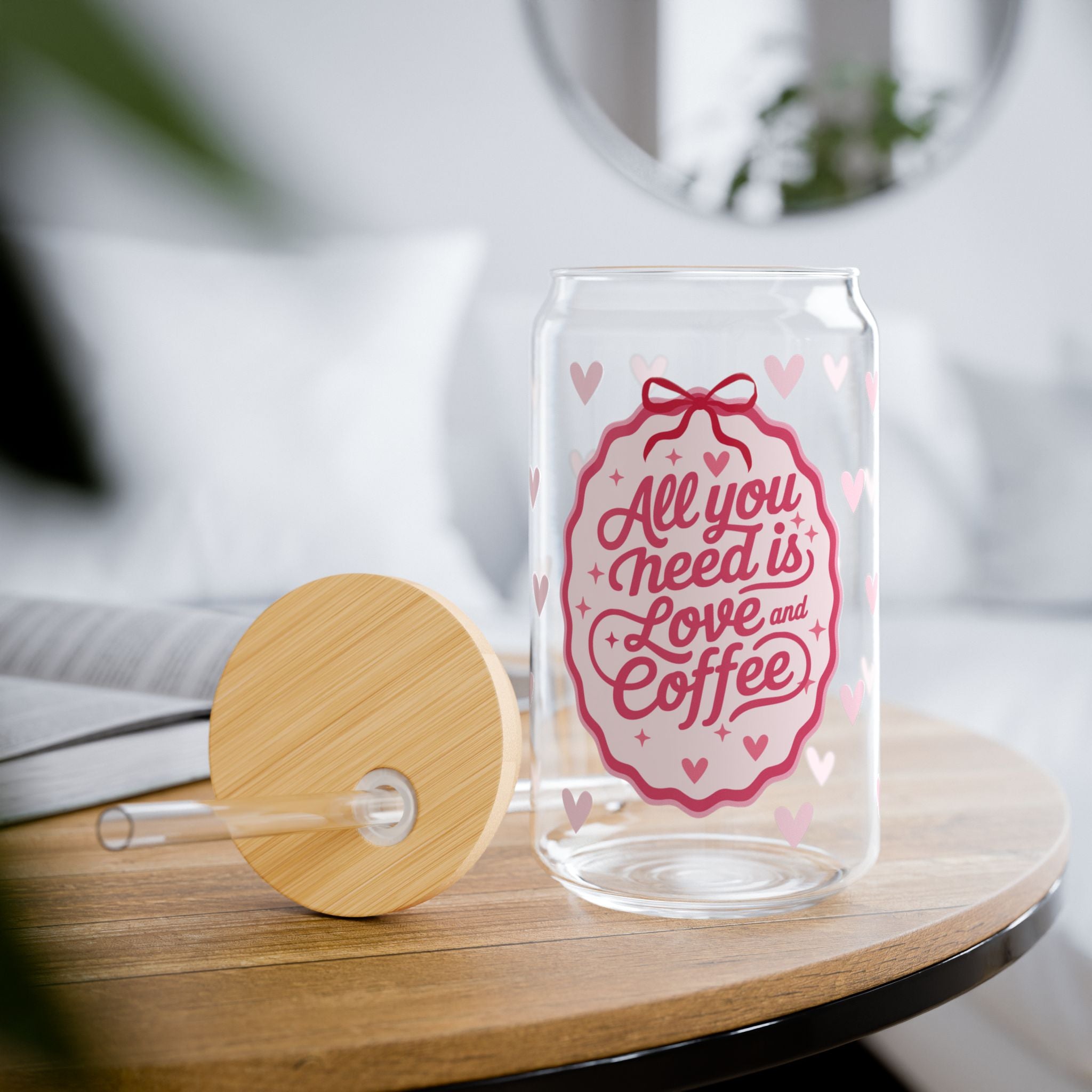 All You Need is Love & Coffee Tumbler Sipper Glass 16oz — Reusable Drink Jar with Lid & Straw