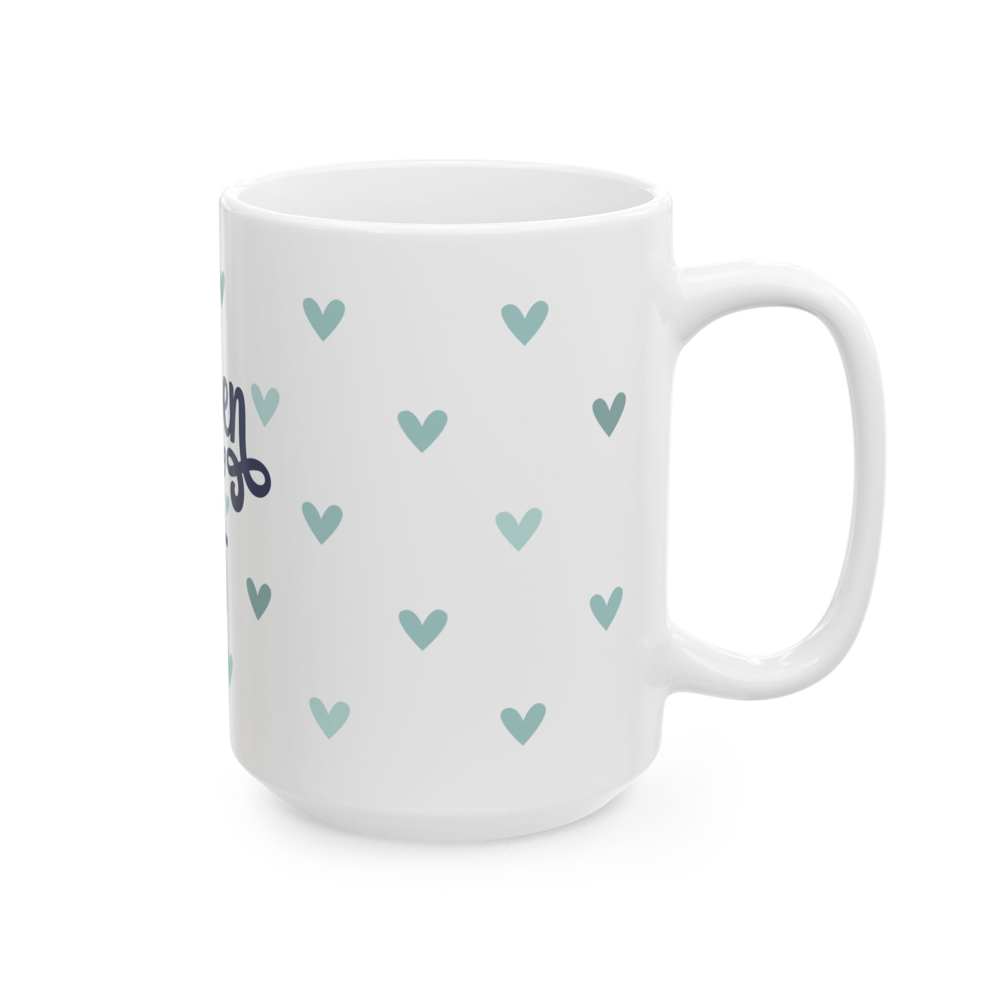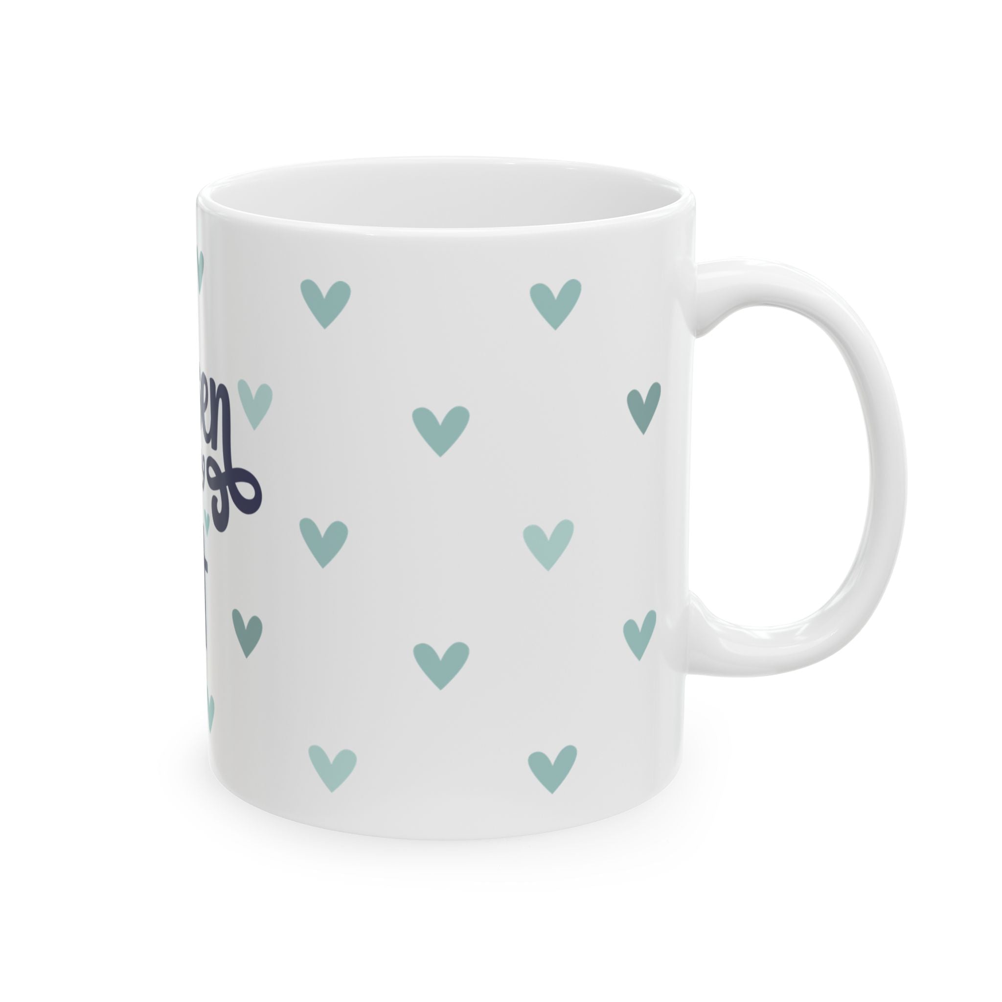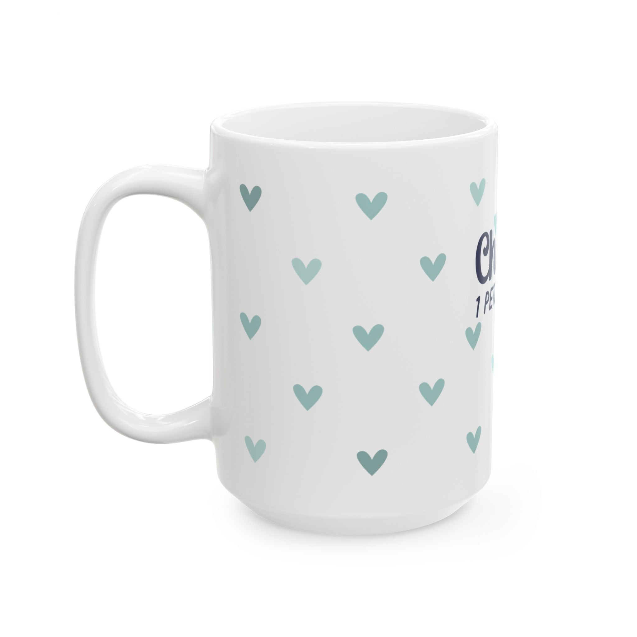 A glossy ceramic mug wrapped in soft teal hearts and a gentle script that reads “Chosen — 1 Peter 2:9,” with a small cross beneath. Each sip becomes a quiet reminder of belonging and purpose — warm coffee or tea feels more anchored when held in a mug that speaks faith with subtlety. The clean white ceramic background keeps the design fresh and uplifting, while the compact handle and shiny finish make daily use comforting and simple. Fits into morning routines, Bible study nights, or as a calming presence on a work desk.