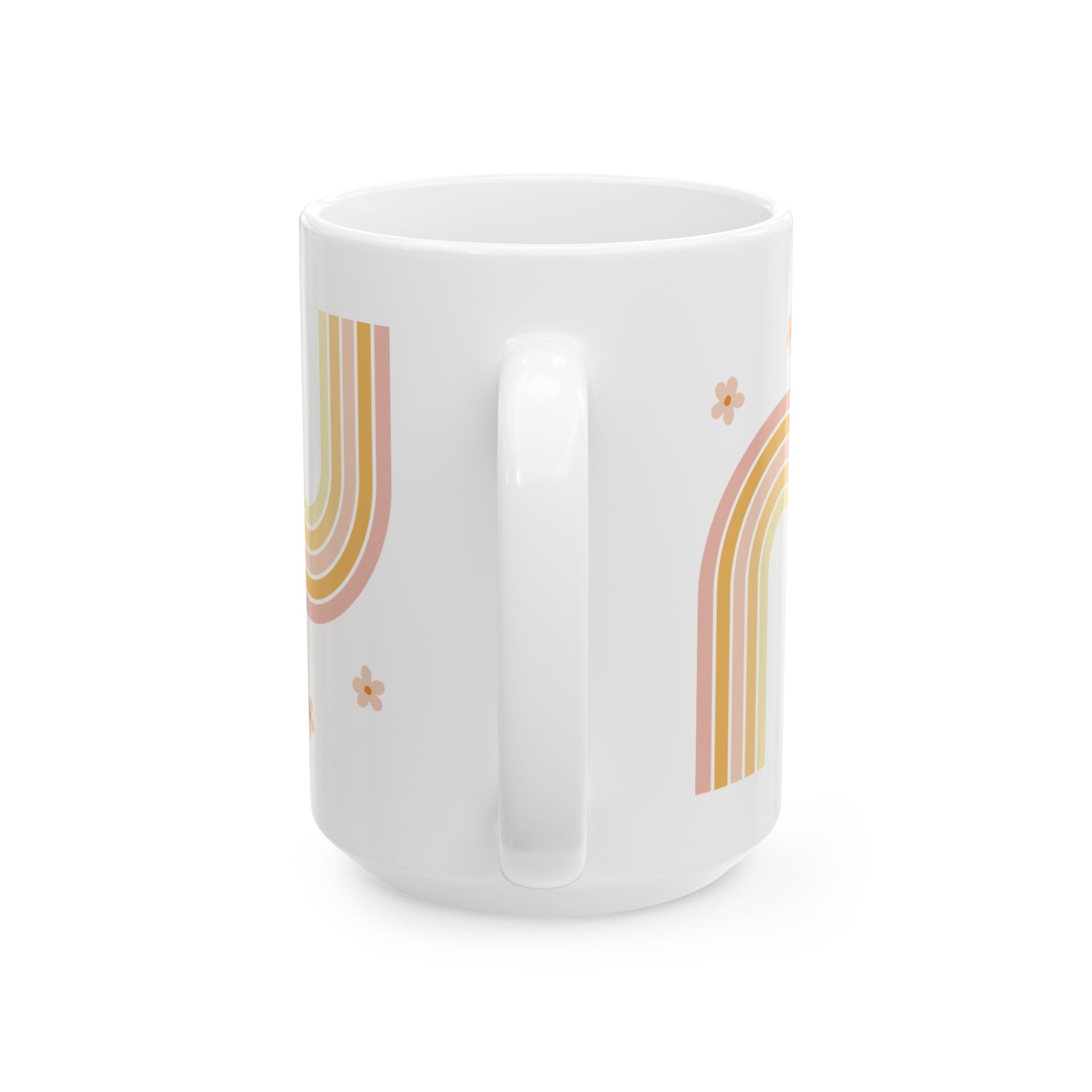 Wrap your morning ritual in soft, sunwashed nostalgia. This glossy ceramic mug carries a warm retro palette of muted peach, mustard and dusty pink rainbows encircling chunky, playful lettering that reads “COFFEE.” Small star-like florals drift between arcs, giving the design a gentle, hand-drawn vibe. It sits light and familiar in the hand, making slow sips and quiet starts feel intentional — a small daily pause that suits creative desks, cozy kitchens, and weekend slowdowns.
