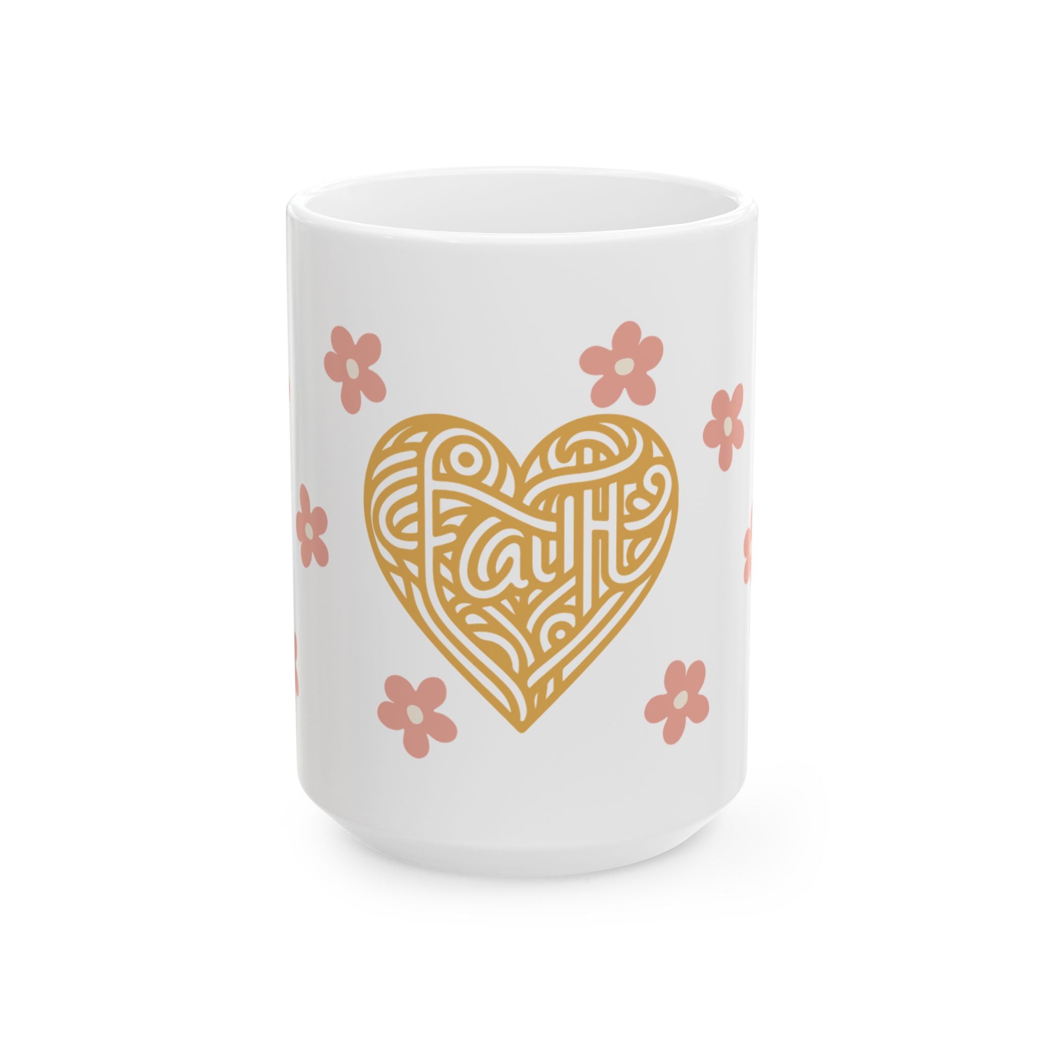 Warm mornings start here. This glossy ceramic mug carries a hand-drawn golden heart at its center, framed by soft, vintage-pink daisies that wrap the cup like a gentle hug. It feels like a calm kitchen sunrise—simple, cheerful, and quietly confident. Sip slow coffee or a creamy chai and let the playful floral pattern brighten a small everyday ritual. Lightweight enough for daily use, the smooth C-handle fits fingers comfortably while the bold print keeps its charm sip after sip.