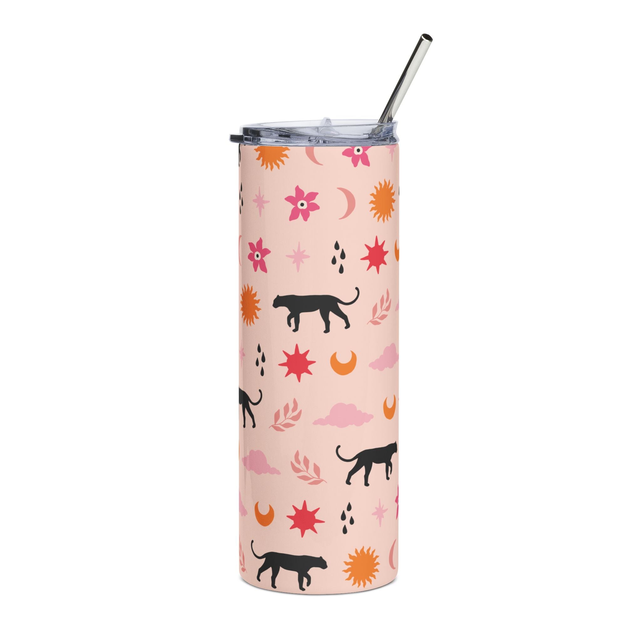 Lightweight, slim, and endlessly cheerful — this 20 oz stainless steel tumbler carries your drink and a little mood lift wherever you go. Soft peachy tones set the stage for tiny black panthers, crescent moons, suns, clouds, and floral accents that repeat around the full 360° printable surface. The glossy protective finish keeps colors bright and resists everyday wear while the included clear lid and metal straw make sipping simple and spill-aware. Tall and narrow, it slips into most cup holders and backpacks, so it’s always ready for a commute, a desk day, or a walk through town with your favorite playlist.
