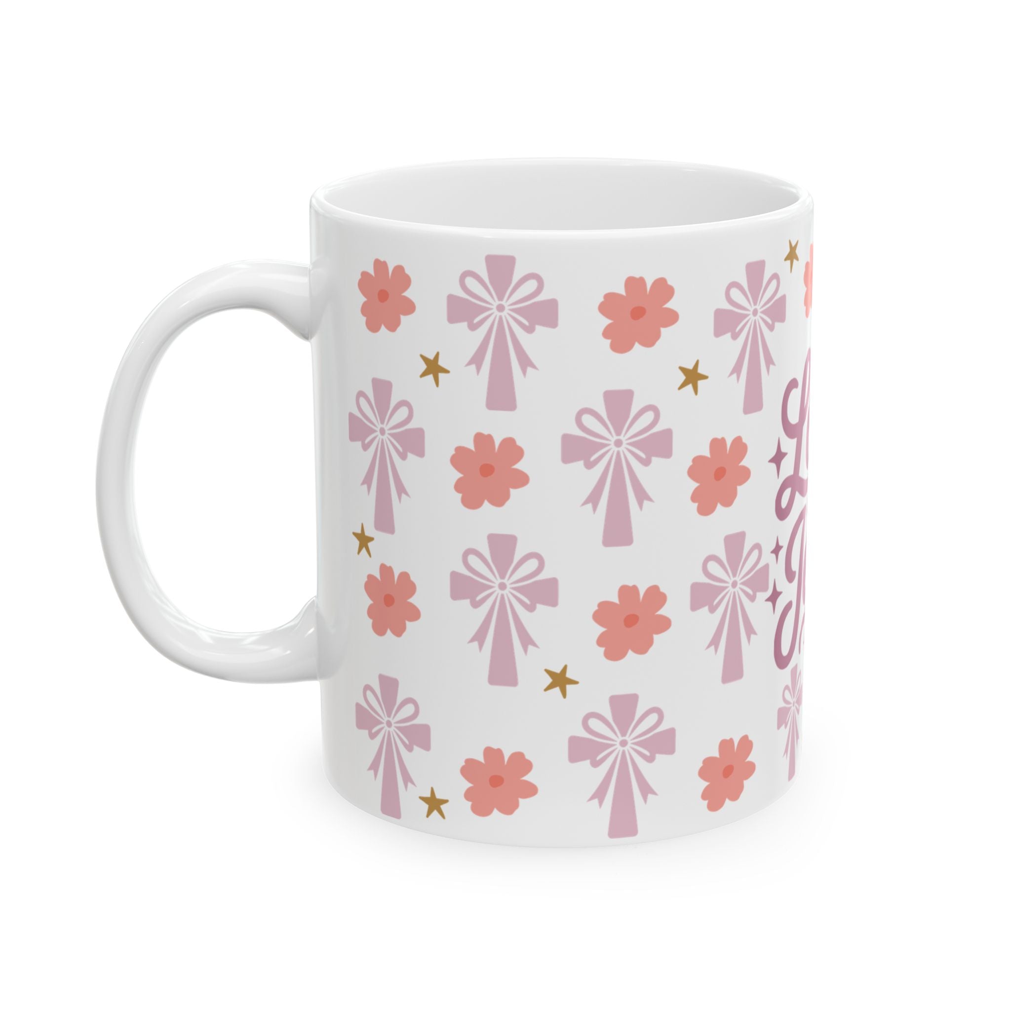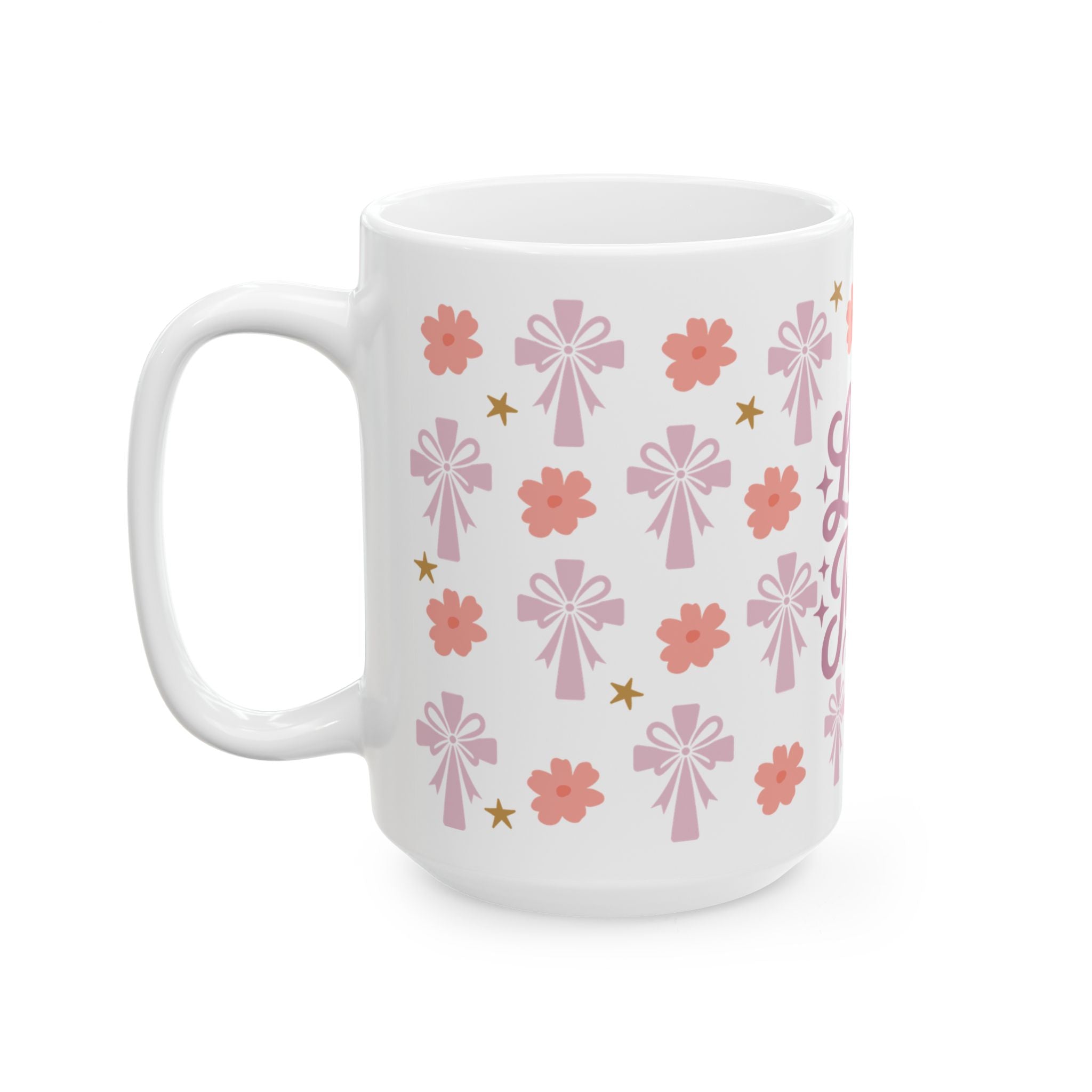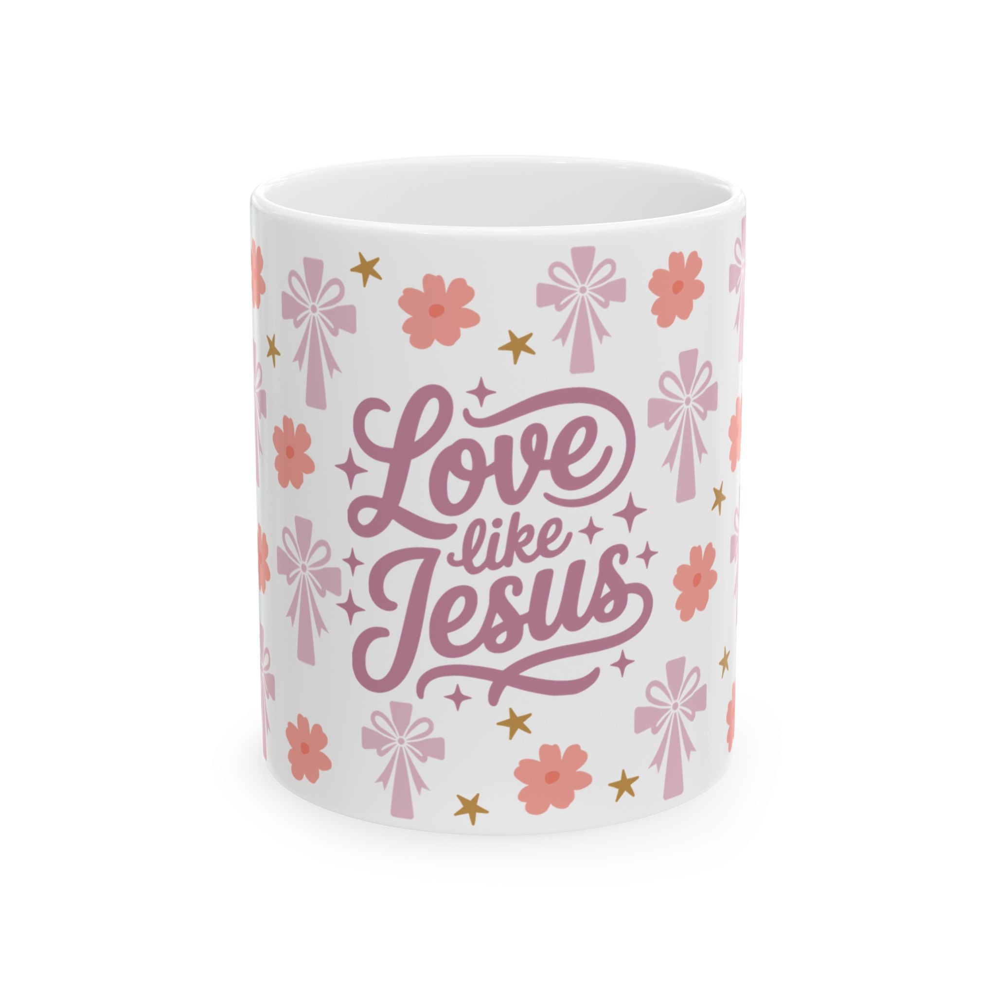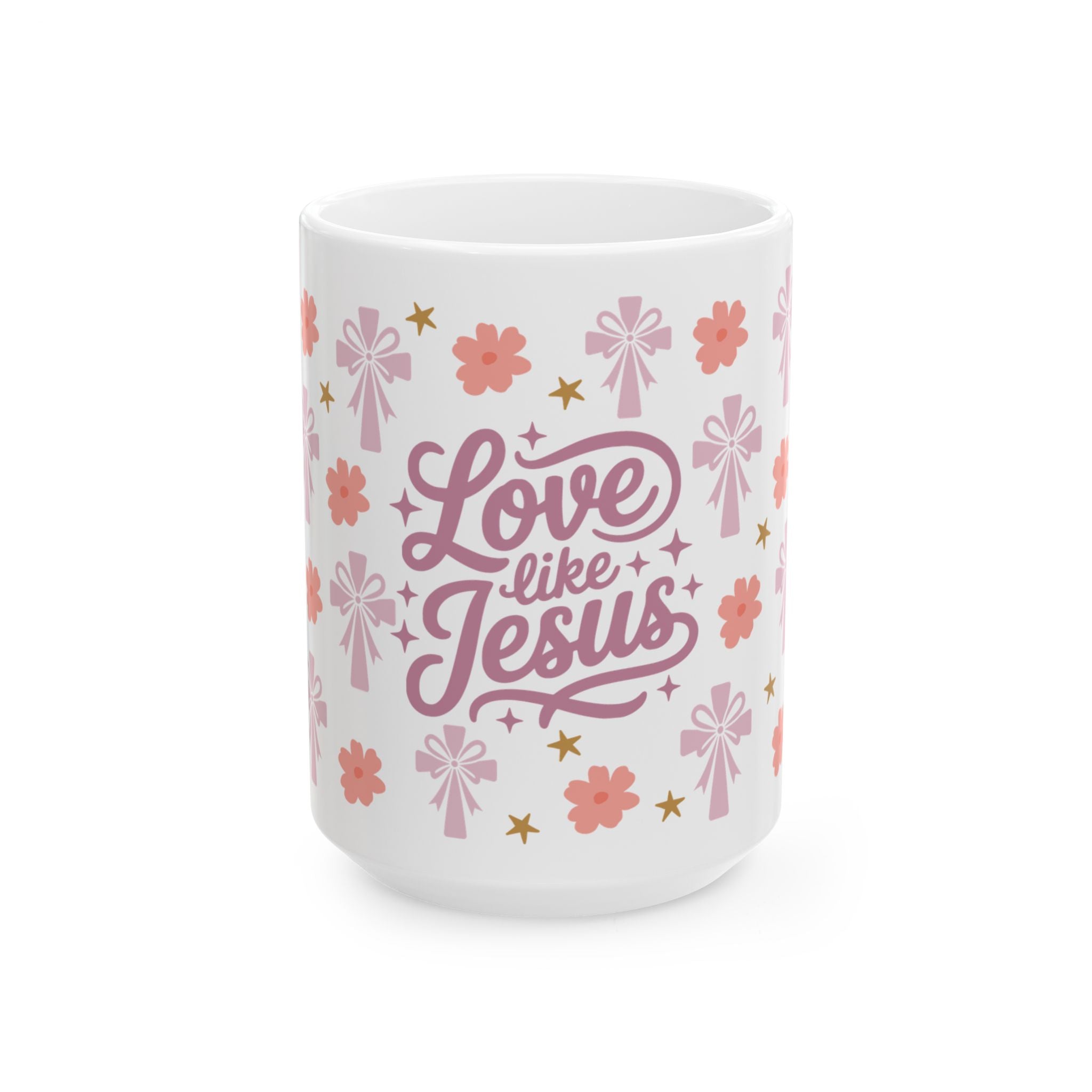 This glossy ceramic mug brings a soft, uplifting touch to quiet mornings and midweek coffee breaks. Pale pink florals, gentle stars, and stylized crosses frame a hand-lettered “Love like Jesus” message, creating a calm, faith-forward look that feels like a warm conversation. Hold it in your hands during devotional time, tuck it into a cozy reading nook, or keep it on your desk as a gentle reminder to choose compassion through the day. The bright print and durable finish keep the design cheerful after repeated use and washings.