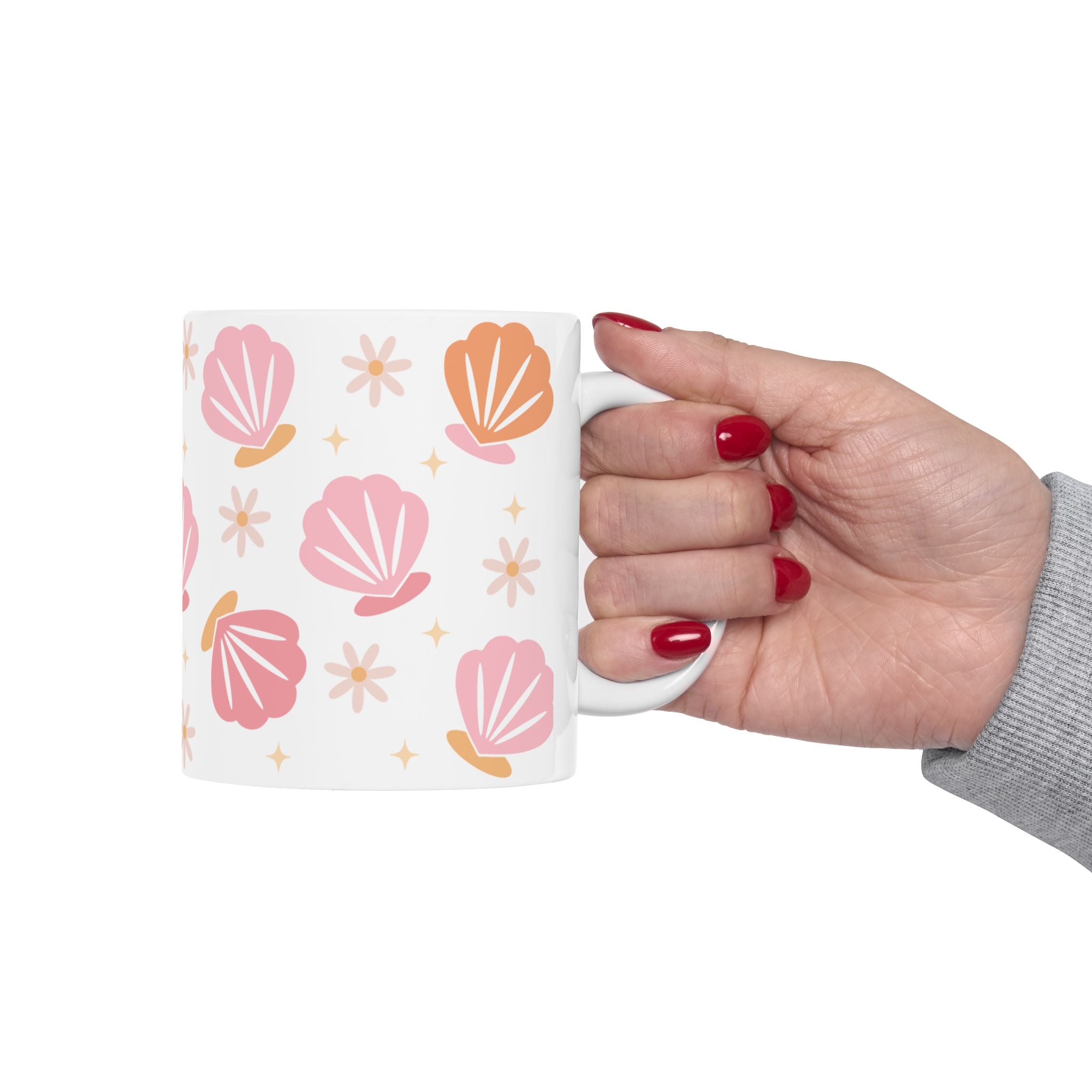 Soft, sunlit mornings on the shore — this glossy ceramic mug brings a playful seaside mood to your daily ritual. Warm pink and coral shells float across a bright white background, accented with tiny starbursts that catch the eye. It feels like a little escape: reach for your favorite brew, breathe in slow, and remember the hush of sand underfoot and gentle tides. Lightweight to hold with a classic C-handle and a shiny finish, it brightens desk breaks, early shifts, and slow weekend sips alike.