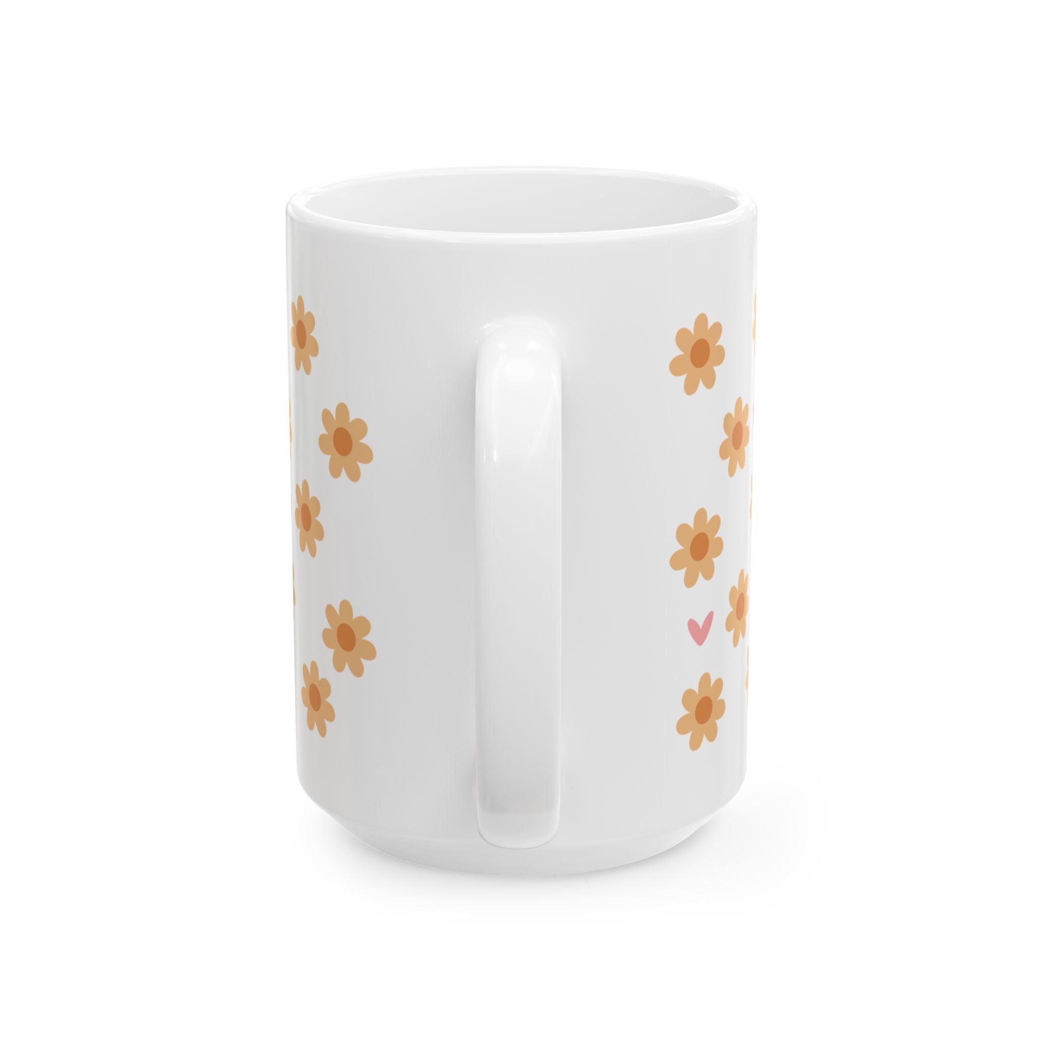 Warm and gentle, this ceramic mug brings a quiet, faith-rooted reminder to morning routines. Soft daisy clusters and tiny hearts circle the cup, framing a subtle script that celebrates strength and resilience. The matte-white canvas makes the peachy florals and blush accents feel like a little note from a friend — comforting, hopeful, and calm. It’s the kind of mug you reach for when you need a steadying sip and a quiet moment of encouragement.