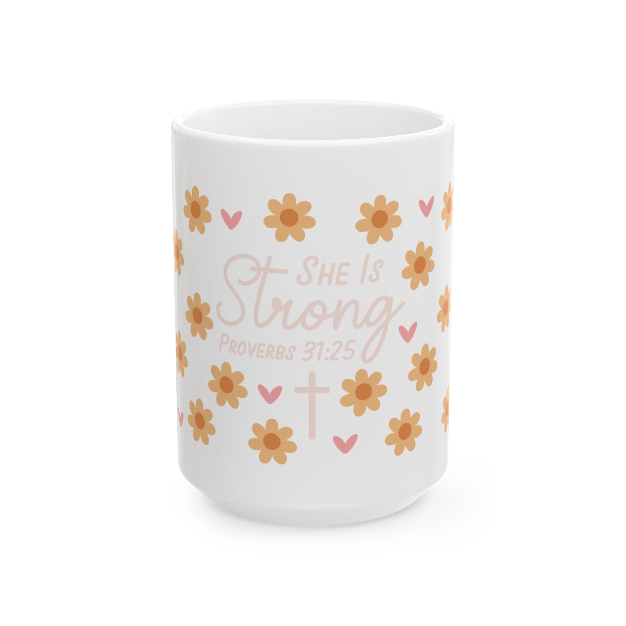 She Is Strong Ceramic Mug — Proverbs 31:25 Yellow Floral Inspirational Coffee Cup