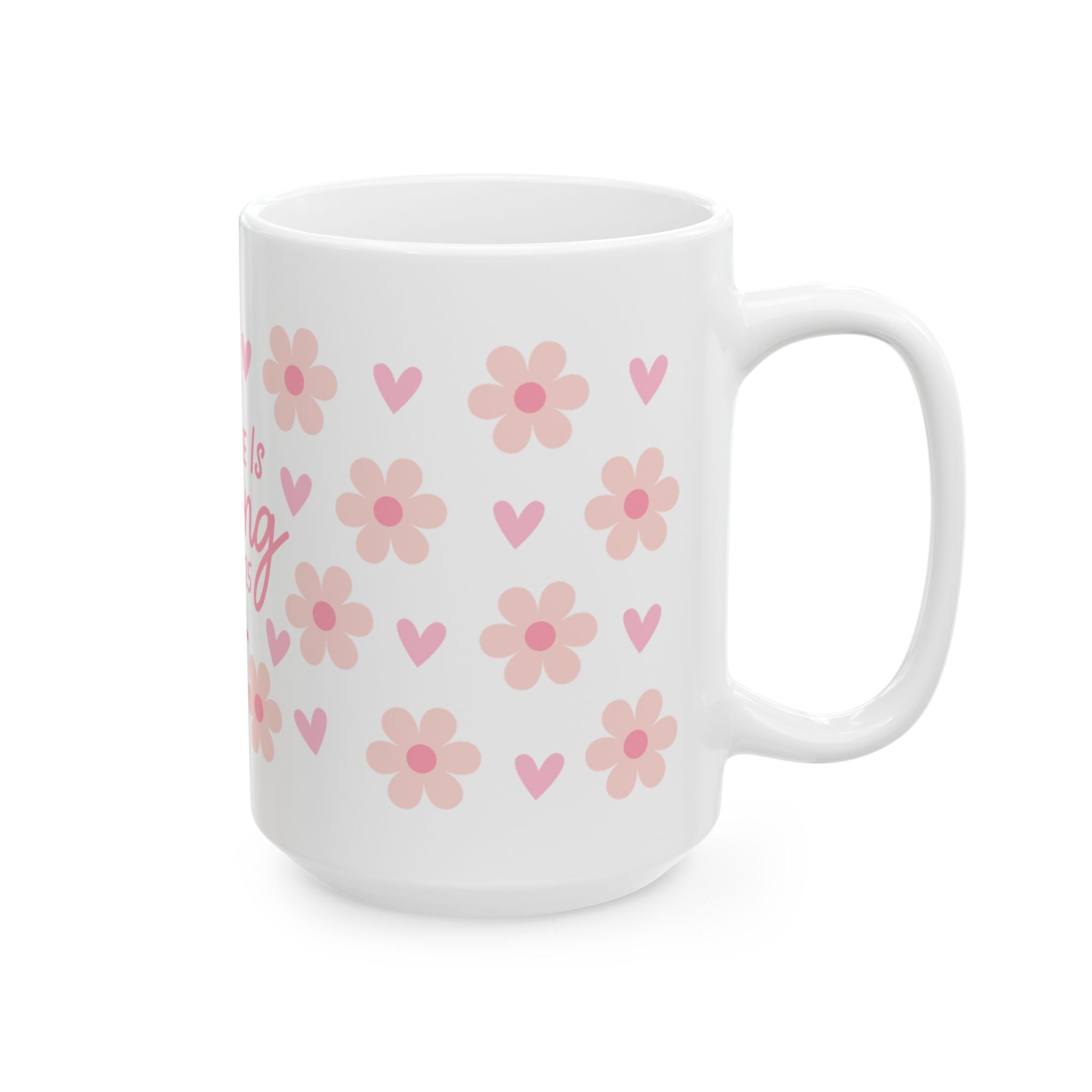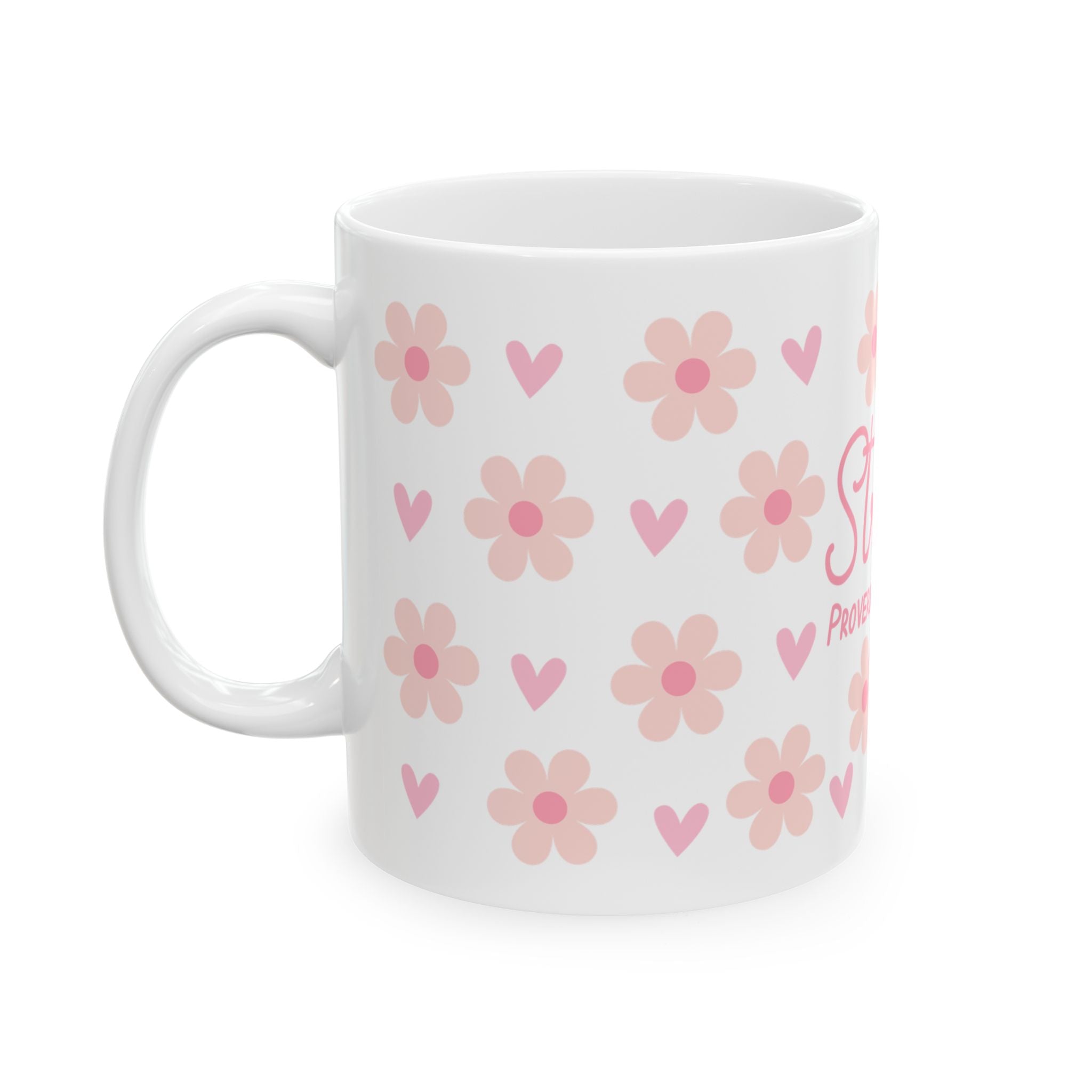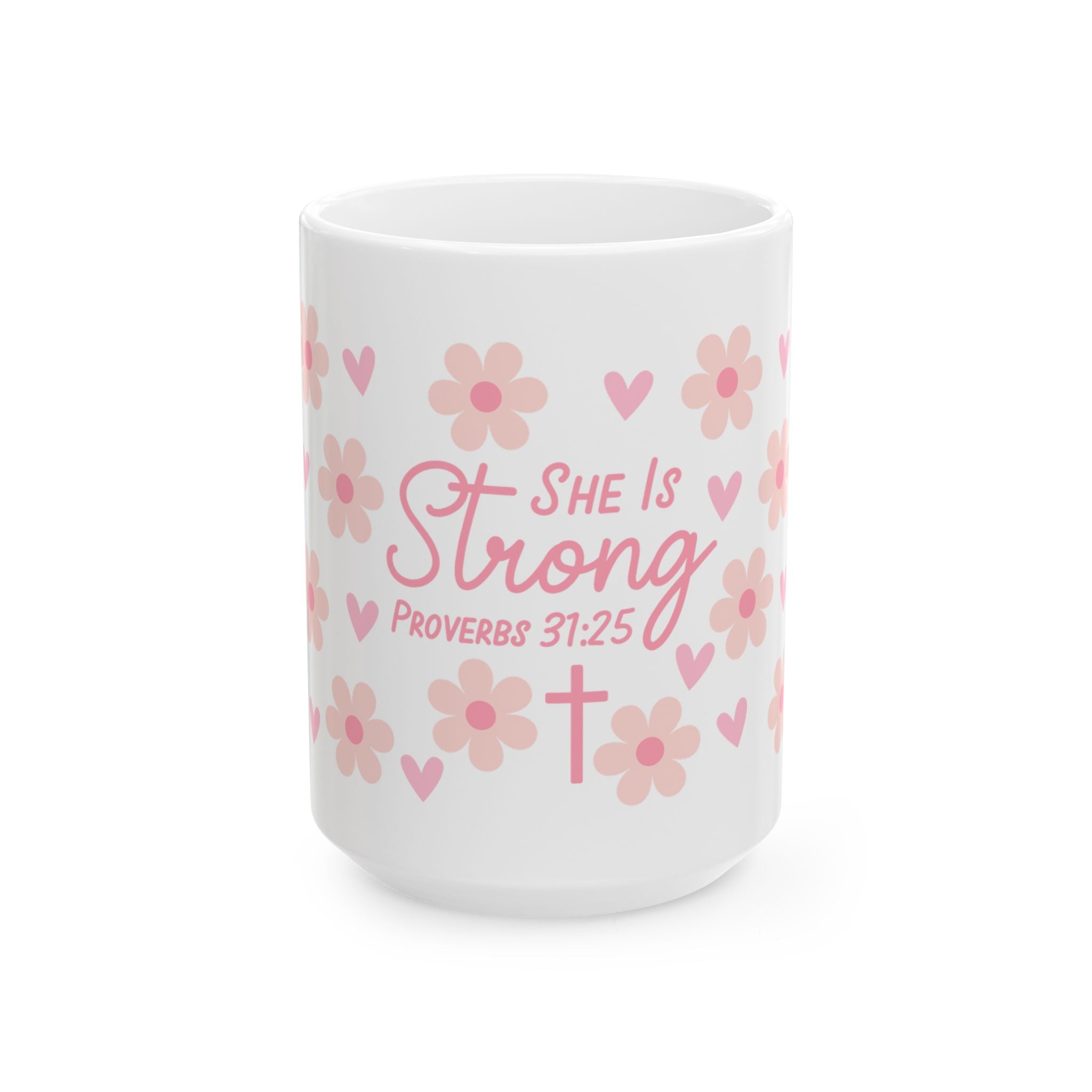 Soft morning light, a warm mug between your hands, and a quiet reminder that strength can be gentle. This glossy ceramic mug carries a sweet floral pattern in blush pinks and a delicate script reading “She Is Strong — Proverbs 31:25,” finished with a small cross. It feels like a whispered blessing during coffee, tea, or cocoa — something that grounds a busy morning or comforts an evening pause. The bright print pops against the clean white ceramic, and the comfortable C-handle makes it easy to cradle while you read, pray, or plan the day.