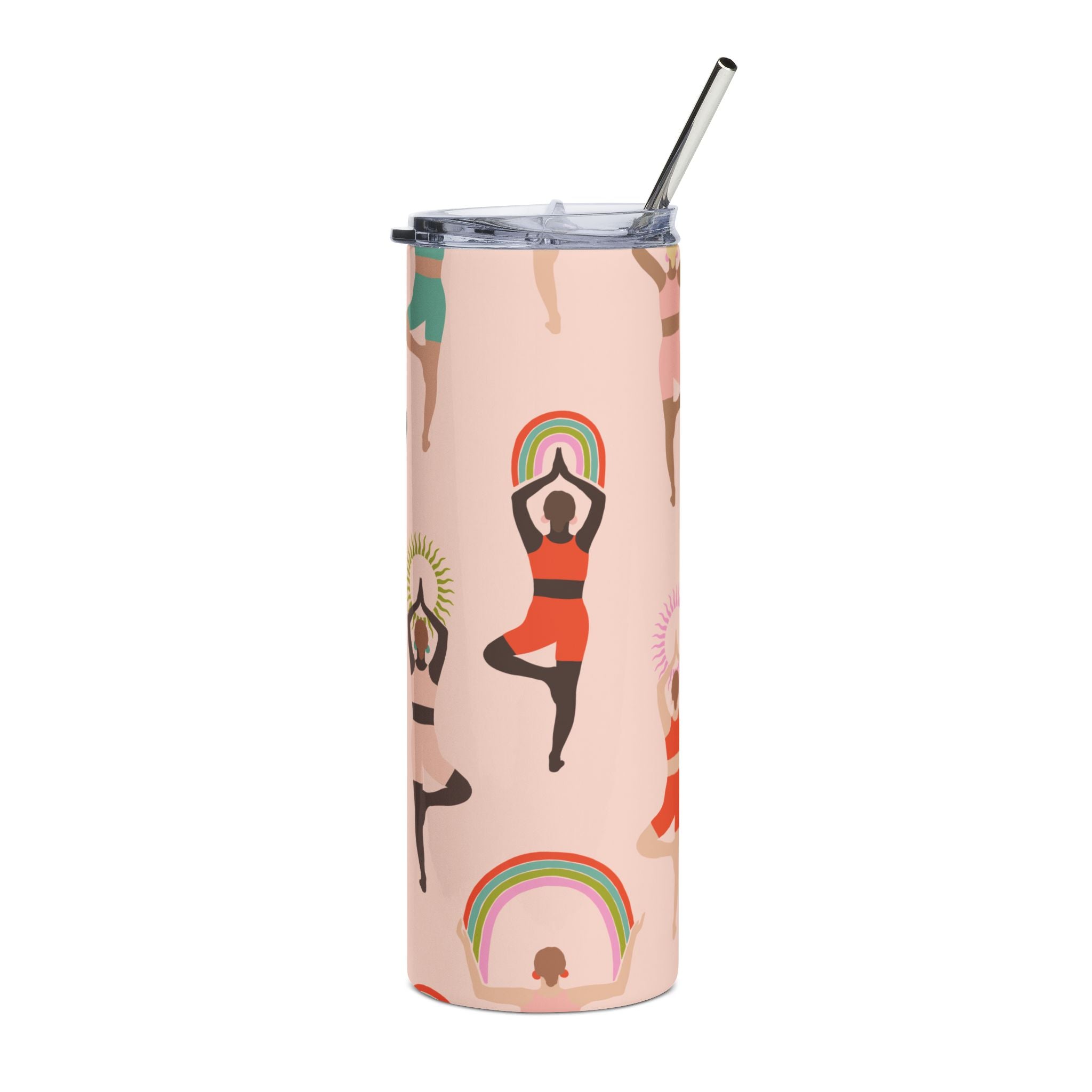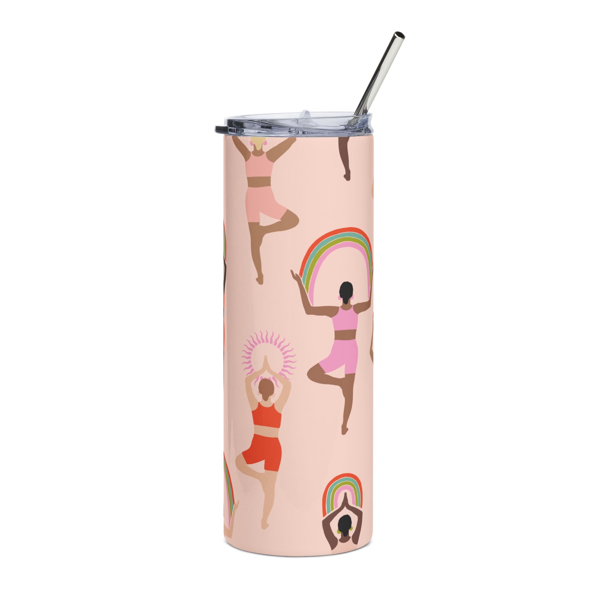 This 20 oz stainless steel tumbler brings calm energy to every sip. Soft peach tones wrap around a repeating pattern of yoga poses and gentle rainbows, a quiet reminder to breathe and move. It sits slim and steady in your hand or cup holder, carrying cold or hot drinks with a glossy protective finish that keeps the artwork bright. The included lid and metal straw make it easy to hydrate between flows, on the mat, or during a mindful commute. Lightweight but sturdy, it slips into a tote or bike cage and becomes part of a daily ritual focused on balance and small, steady moments of self-care.