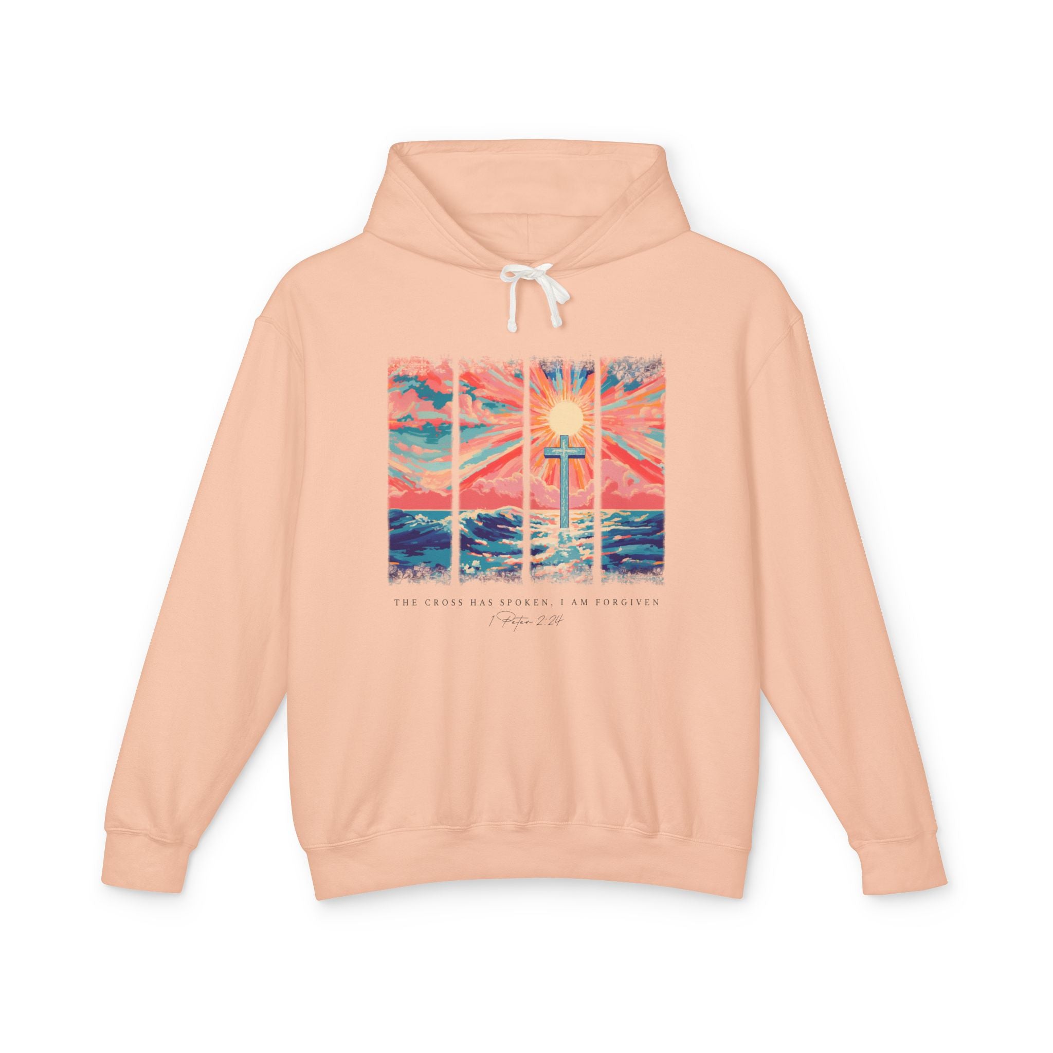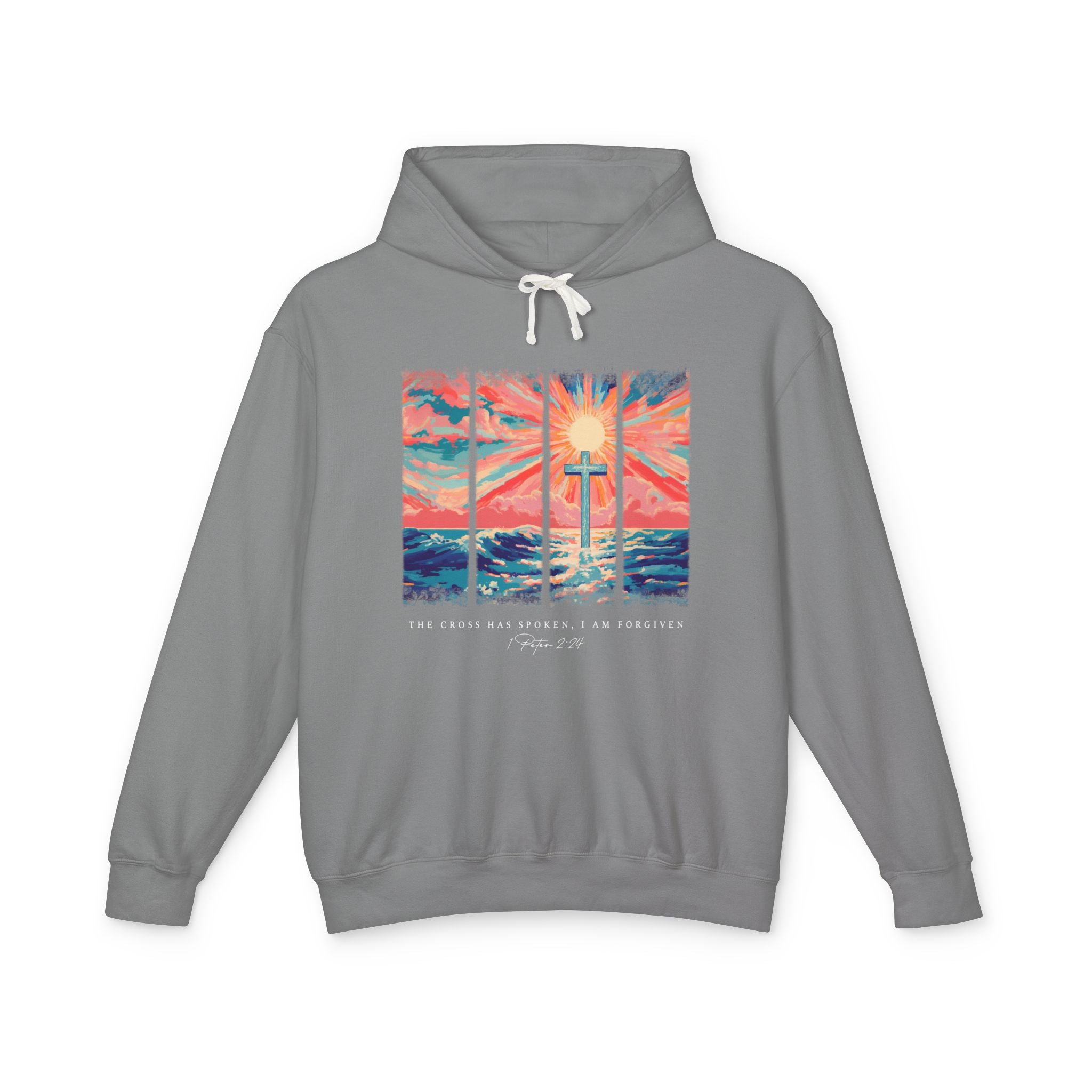 Wrap yourself in comfort and truth with our The Cross Has Spoken, I Am Forgiven hoodie. Featuring a vibrant sunset over rolling waves and a bold cross at the center, this inspiring design is paired with 1 Peter 2:24 as a powerful reminder of grace. Soft, cozy, and unisex in fit, it’s perfect for cool days, church gatherings, or everyday faith-filled style.