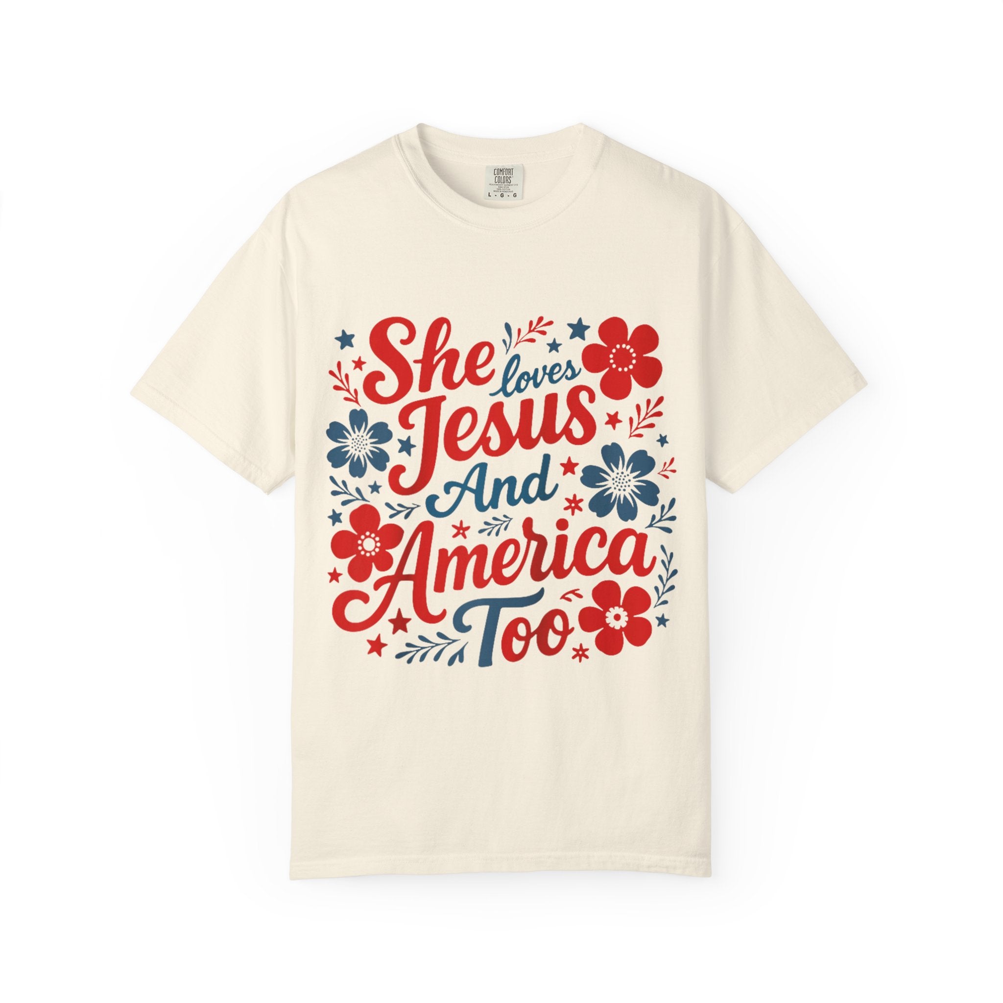 Our She Loves Jesus and America Too graphic tee blends faith and patriotic spirit in one bold, uplifting design. Featuring vibrant lettering and floral accents, it offers a comfortable relaxed fit perfect for everyday wear, holidays, or gatherings. Pair it with denim or shorts for an easy, confident look that celebrates what matters most with style and heart.