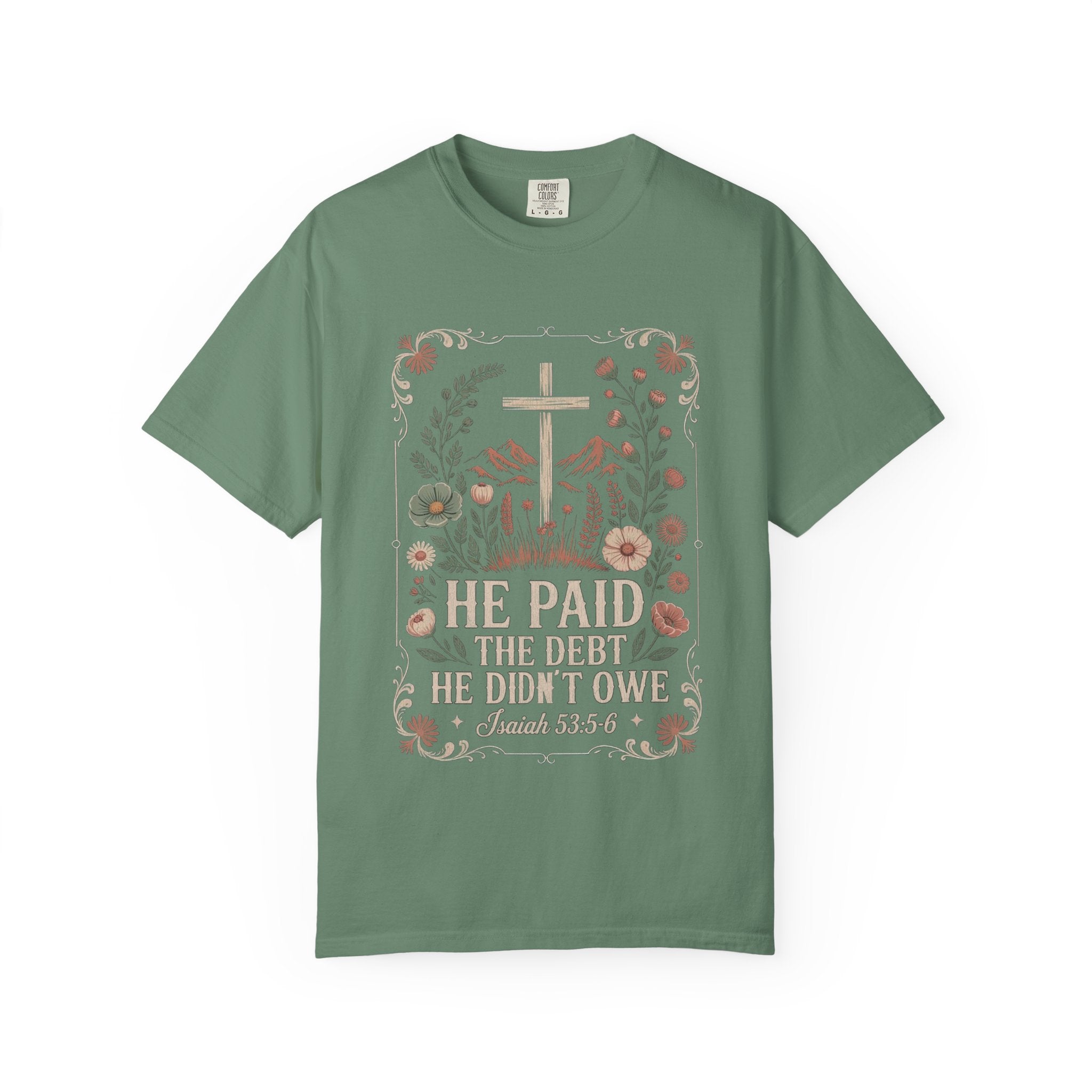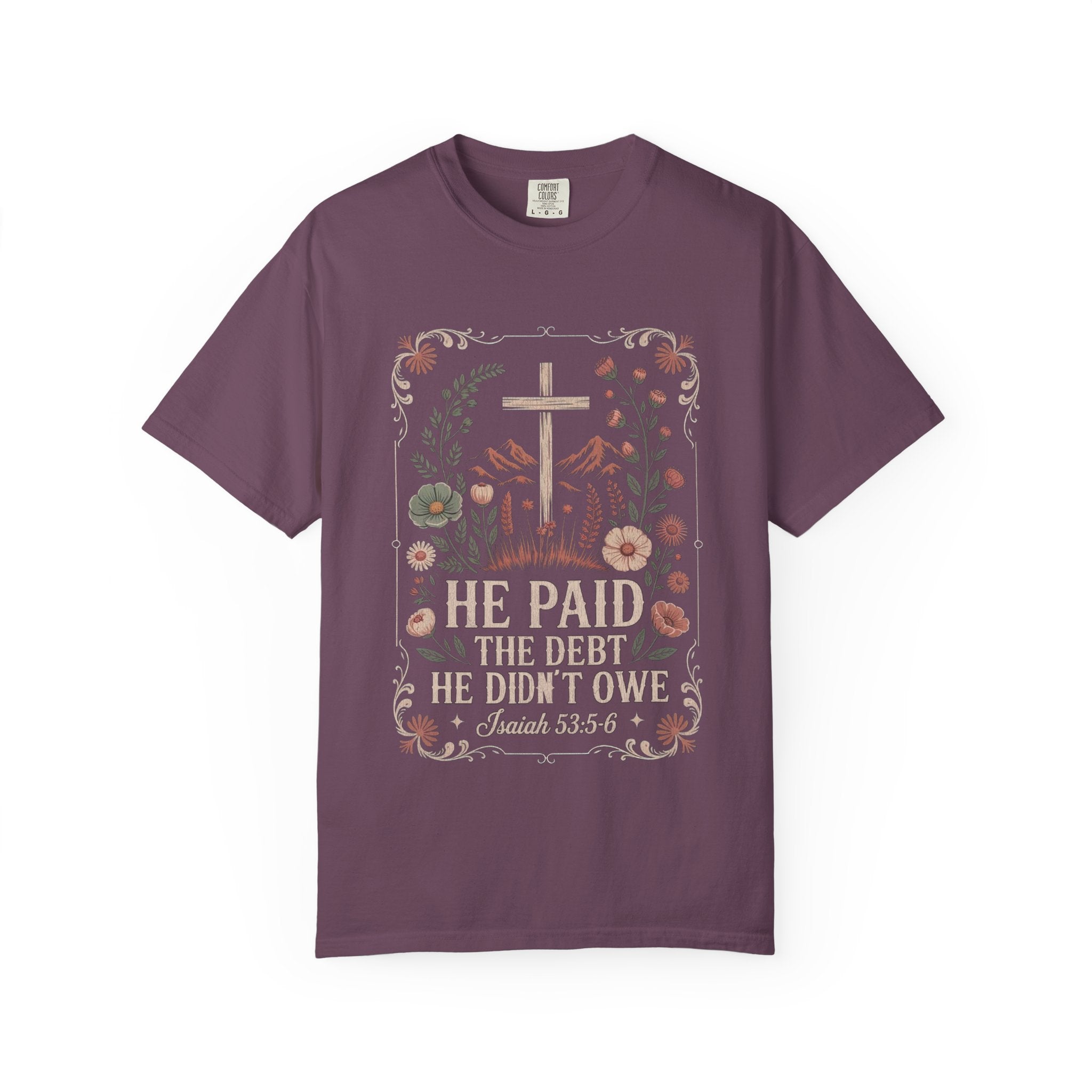 Share a powerful message of grace with our He Paid the Debt He Didn’t Owe Christian distressed tee. Featuring a vintage inspired cross and floral design with Isaiah 53:5–6, this unisex shirt beautifully reflects the sacrifice and redemption found in Christ. Made from soft, breathable fabric with a relaxed fit, it’s perfect for church, Bible study, outreach events, or everyday faith based style.