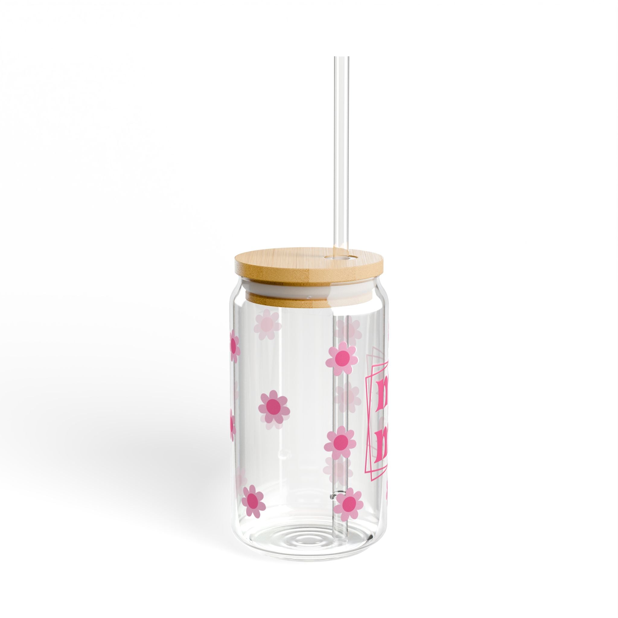 Mama Pink Flower Tumbler Sipper Glass 16oz — Reusable Drink Jar with Lid & Straw
