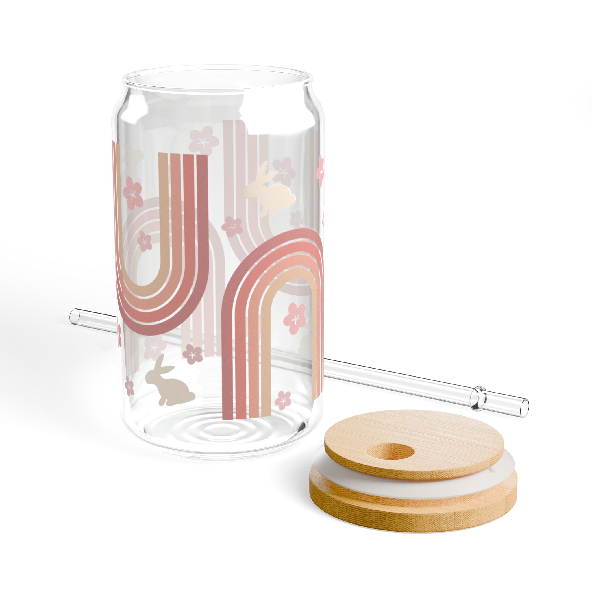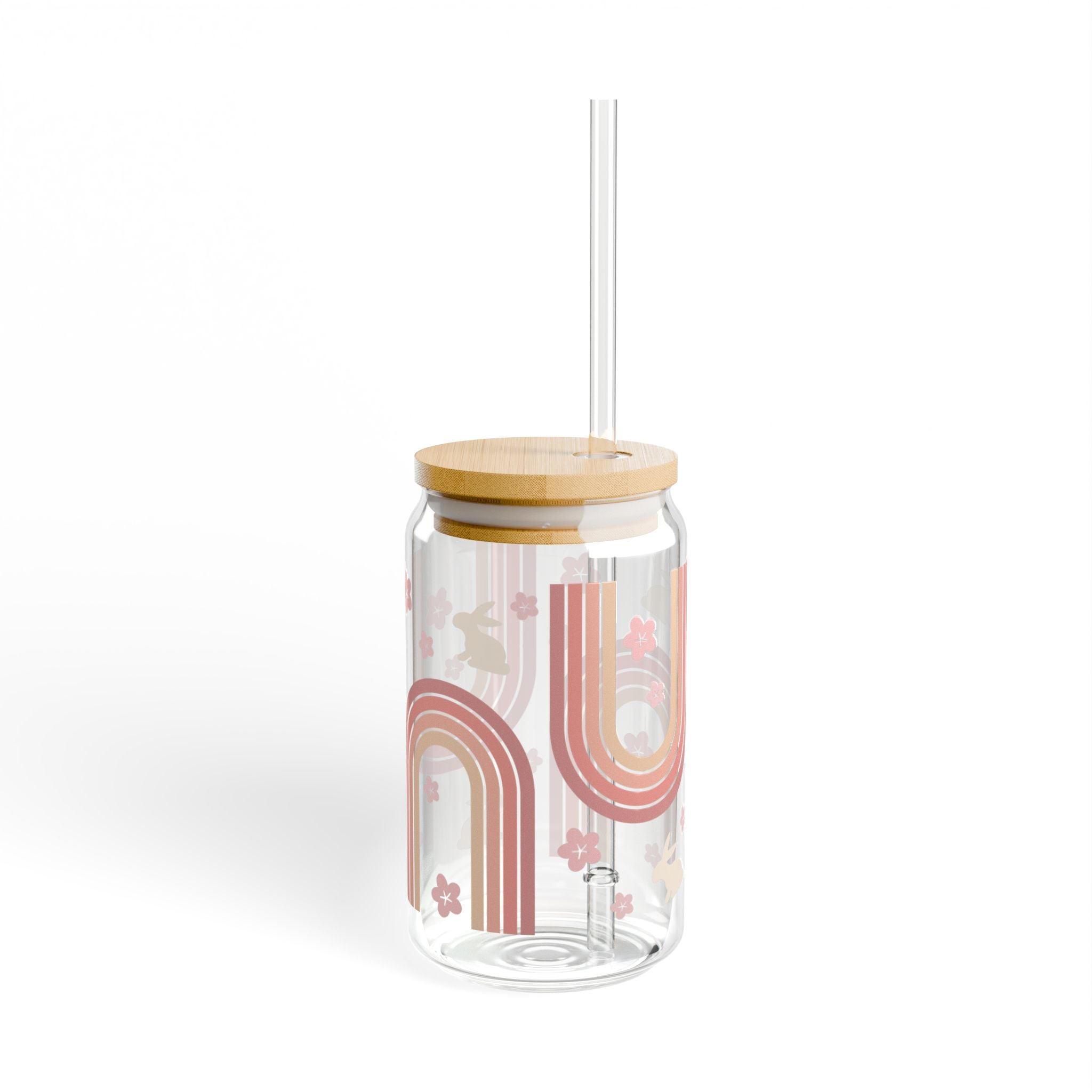 Retro Rainbow Bunny Tumbler Sipper Glass 16oz — Reusable Drink Jar with Lid & Straw