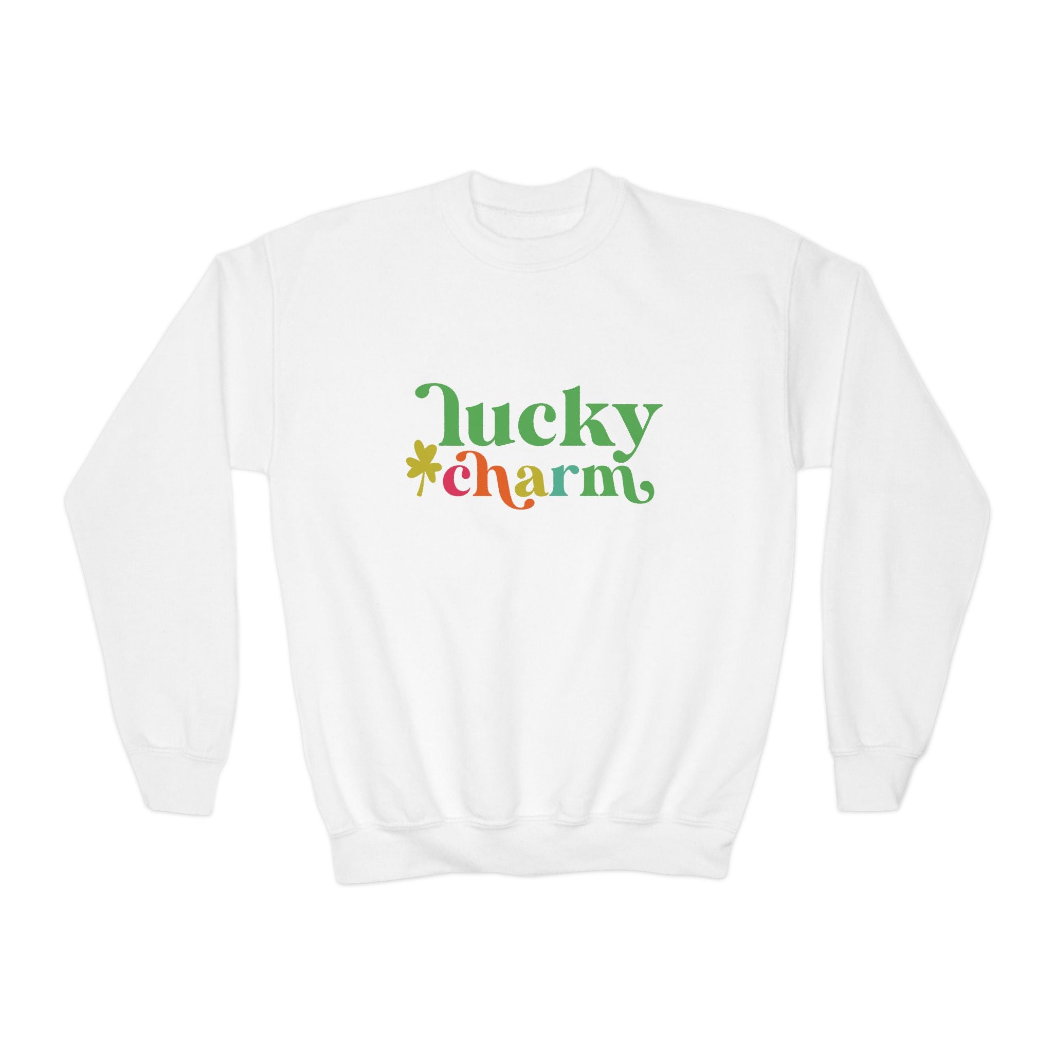 Our Lucky Charm Shamrock St. Patrick’s Day Kids’ Crewneck Graphic Sweatshirt is a cozy and festive favorite for celebrating in style. Featuring colorful “Lucky Charm” lettering with shamrock detail, this soft youth crewneck keeps kids warm and comfortable for school parties, parades, and chilly spring days. Durable and easy to layer. Add this lucky sweatshirt to your cart today! 🍀