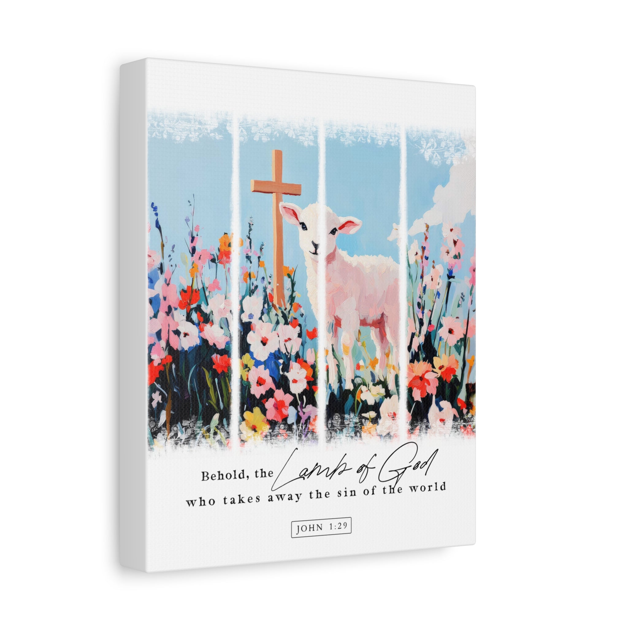 A gentle, faith-filled canvas that brings a quiet moment of reverence to any room. Soft pastels and painterly brushstrokes form a lamb standing amid a wildflower meadow, with a simple cross rising behind it. The text beneath—“Behold, the Lamb of God who takes away the sin of the world” (John 1:29)—reads like a whispered prayer. Stretched on a slim pine frame, the matte finish gives a soft, museum-like look that reduces glare and keeps the colors feeling intimate. Hang it in a nursery, entryway, or reading nook to invite reflection, calm, and a reminder of grace into daily life.