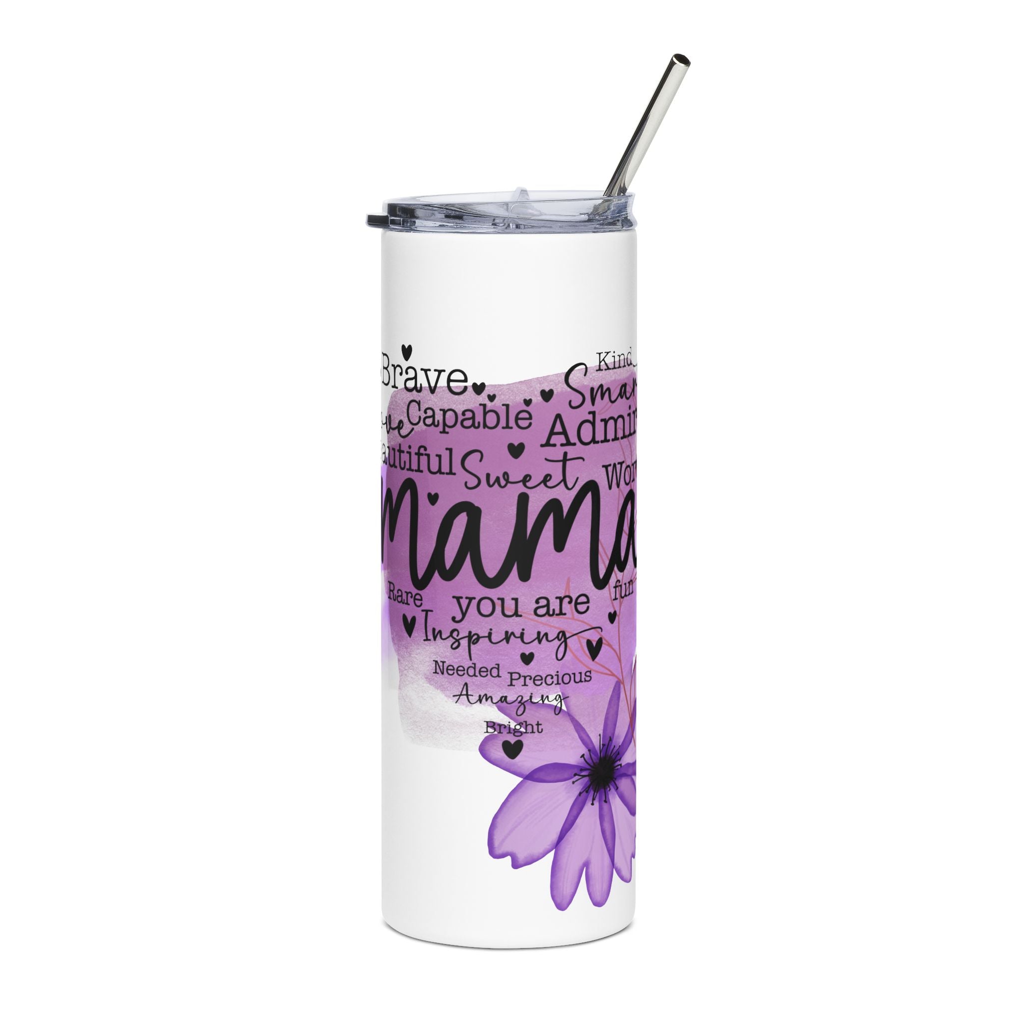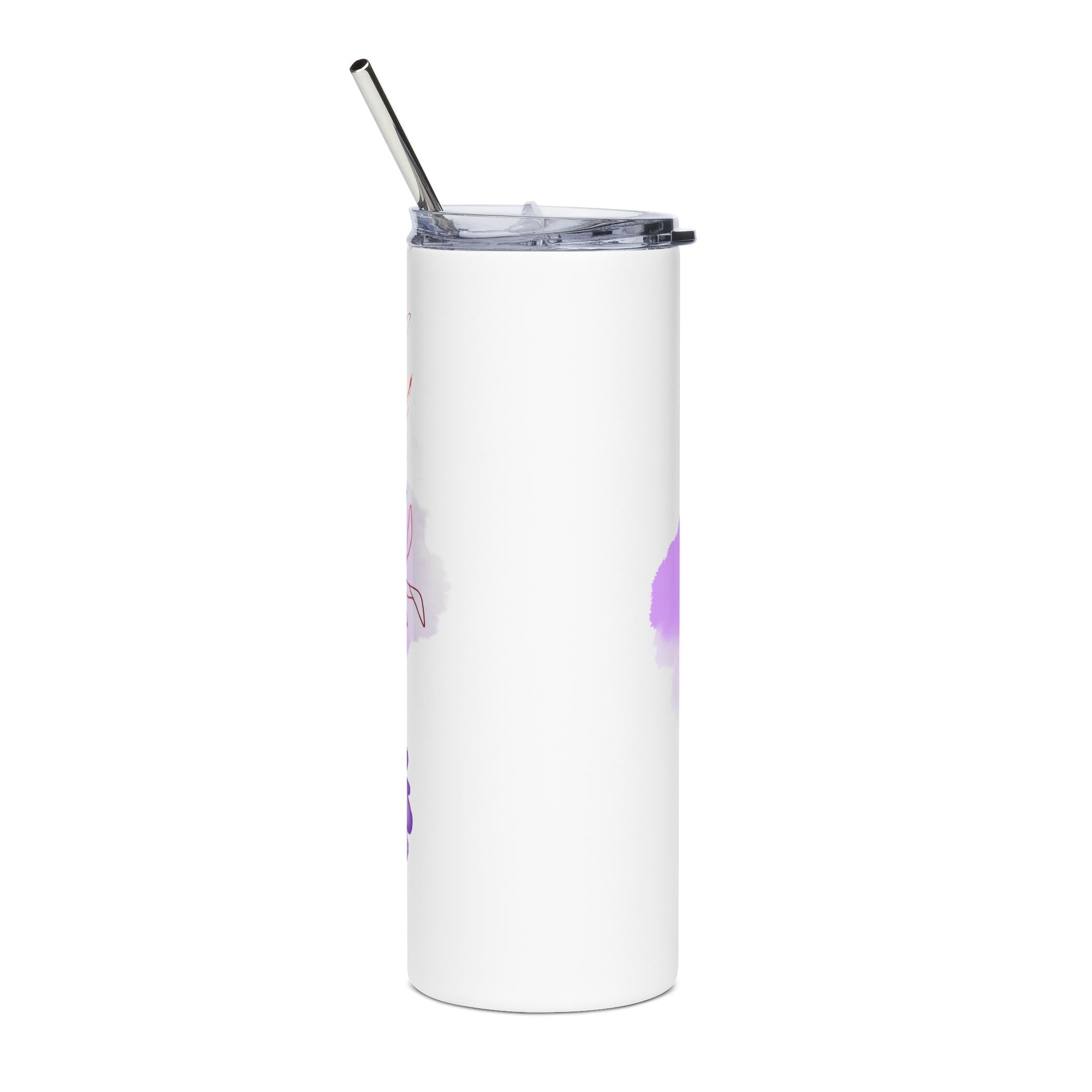 A slim, stainless steel 20oz tumbler wrapped in soft watercolor purples and a heartfelt word-heart design. It feels like a quiet morning cuppa held between loving hands — light, personal, and reassuring. The glossy, protective finish catches the light, making the watercolor blooms and hand-lettered words stand out while the included clear lid and reusable straw keep drinks spill-resistant and easy to sip on the go. It slips into a bag or car cup holder and becomes an everyday companion for those who carry small reminders of love and encouragement with them.
