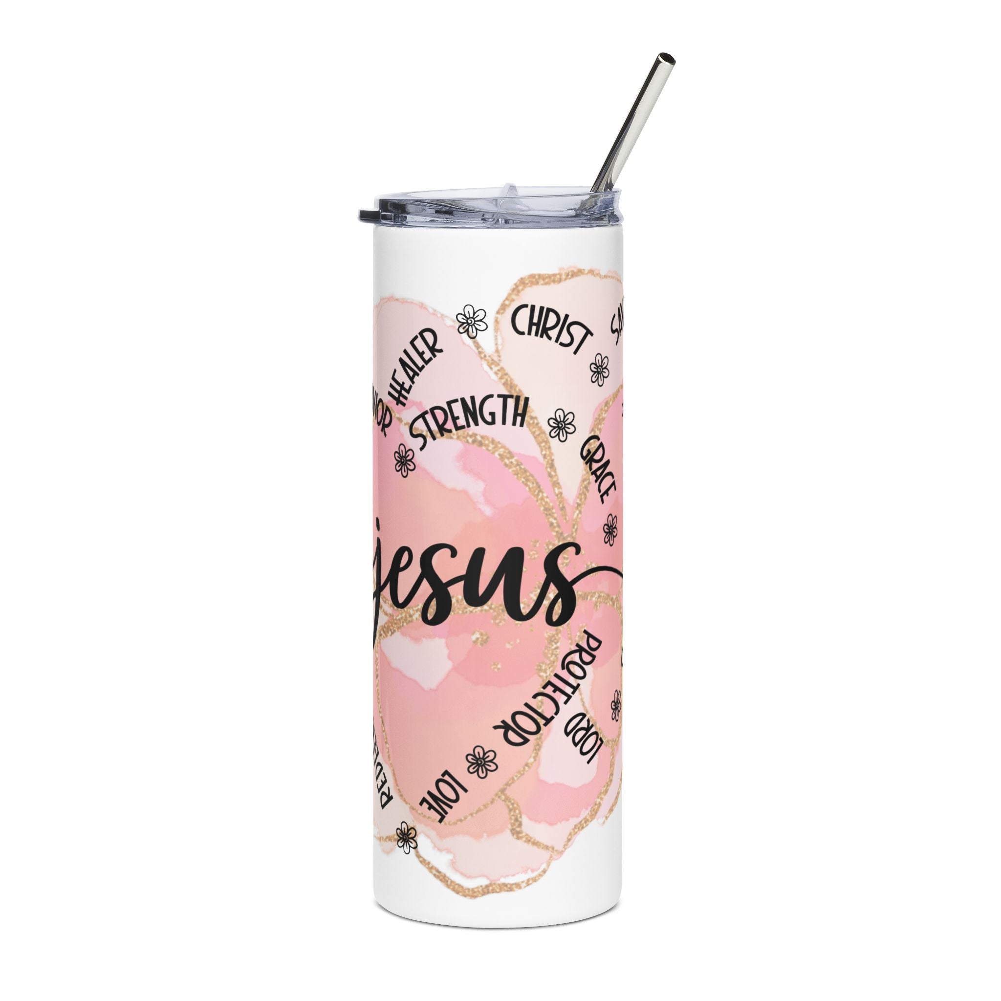 This slim 20 oz stainless steel tumbler carries a soft, faith-forward design that feels like a quiet reminder in your hand. The tall cylinder shows a warm watercolor heart in blush and gold accents surrounding the name “Jesus,” with small words of comfort encircling the motif. It keeps drinks secure with a clear lid and reusable straw, and the glossy protective finish preserves the art while resisting everyday wear. Lightweight and narrow enough to slip in most cup holders, it travels with you to church gatherings, morning devotions, or quiet moments on the porch — a subtle, everyday expression of devotion.