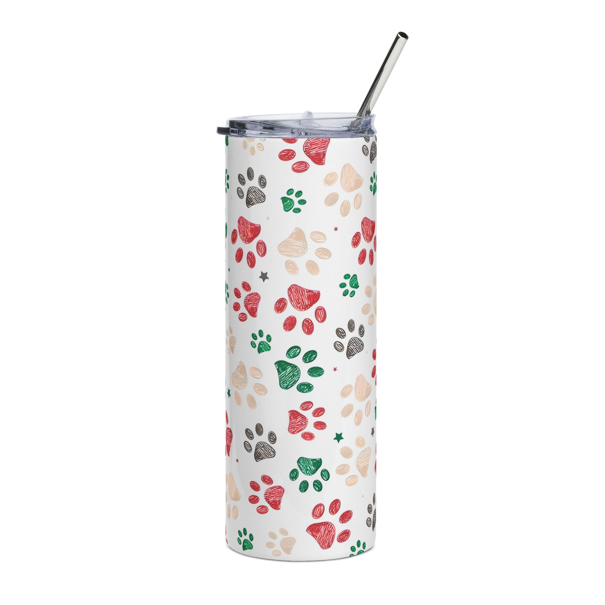 Product features - Durable high-grade stainless steel resists rust and corrosion - 20 oz (600 ml) capacity with slim 3.11″ × 8.42″ profile - Includes clear lid and reusable metal straw for easy sipping - Glossy protective varnish over full 360° printable paw-print design - Cylindrical, matte-finish blank with a bright, long-lasting printed surface