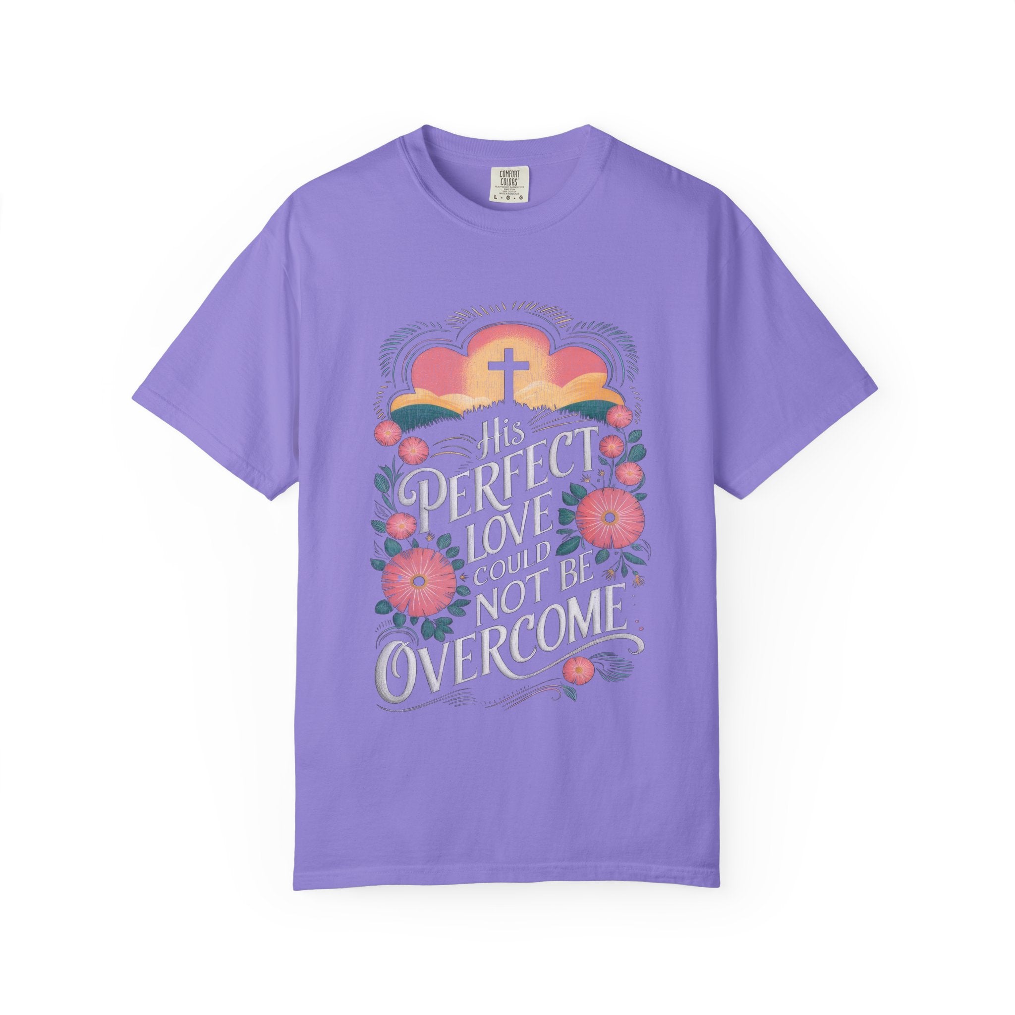Celebrate the power of the resurrection with our His Perfect Love Could Not Be Overcome Christian tee. Featuring a beautiful floral cross design with soft sunset tones, this vintage-inspired graphic reminds us that Christ’s love conquered the grave. Printed on a comfortable, relaxed unisex distressed tee, it’s perfect for Easter, church gatherings, or everyday faith-filled style and encouragement.