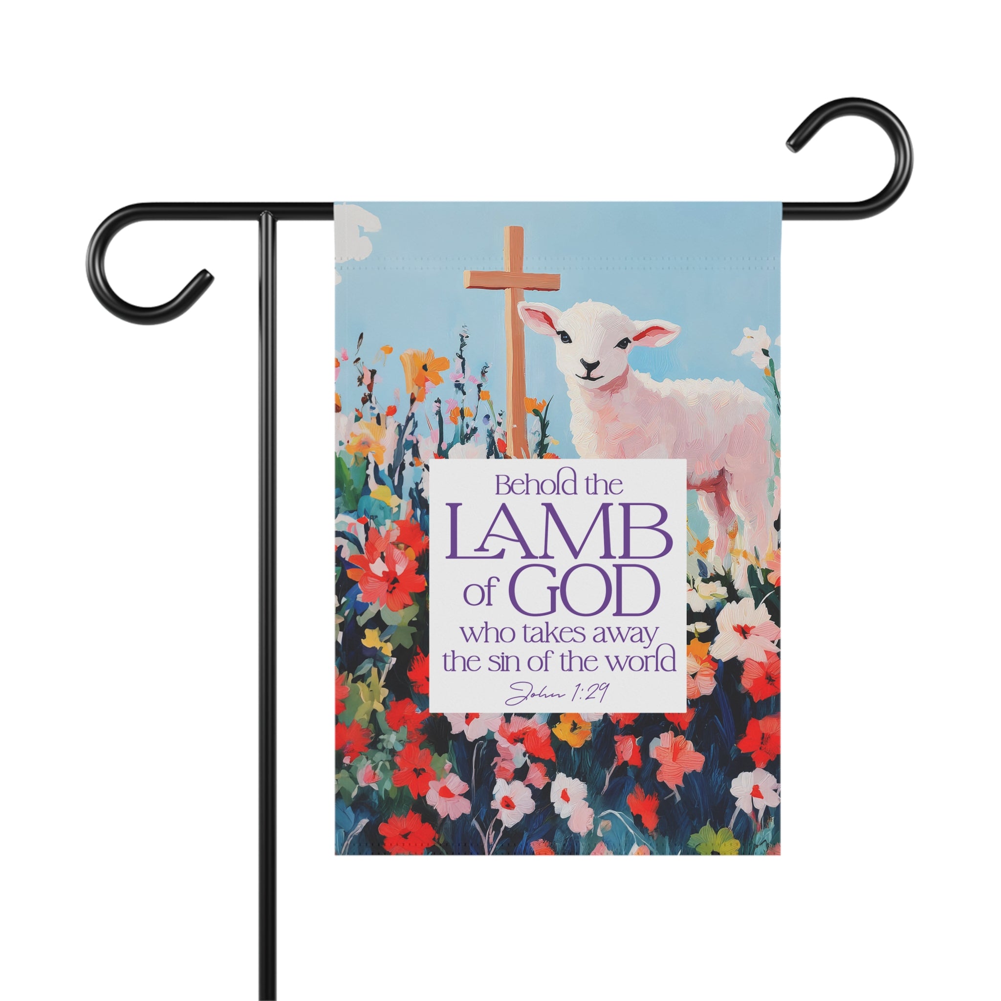 A soft, devotional garden banner that brings a quiet moment of worship to outdoor and indoor spaces. Painted florals frame a gentle lamb and a wooden cross, with the Scripture verse “Behold the Lamb of God who takes away the sin of the world — John 1:29” set in a clear, reverent type. The lightweight poplin-canvas drapes nicely from a standard garden pole or stand and shows vivid, double-sided color so the scene reads from either side. Hang it on a sunny porch, beside a front walk, or in a prayer corner to invite reflection and a sense of calm hope.