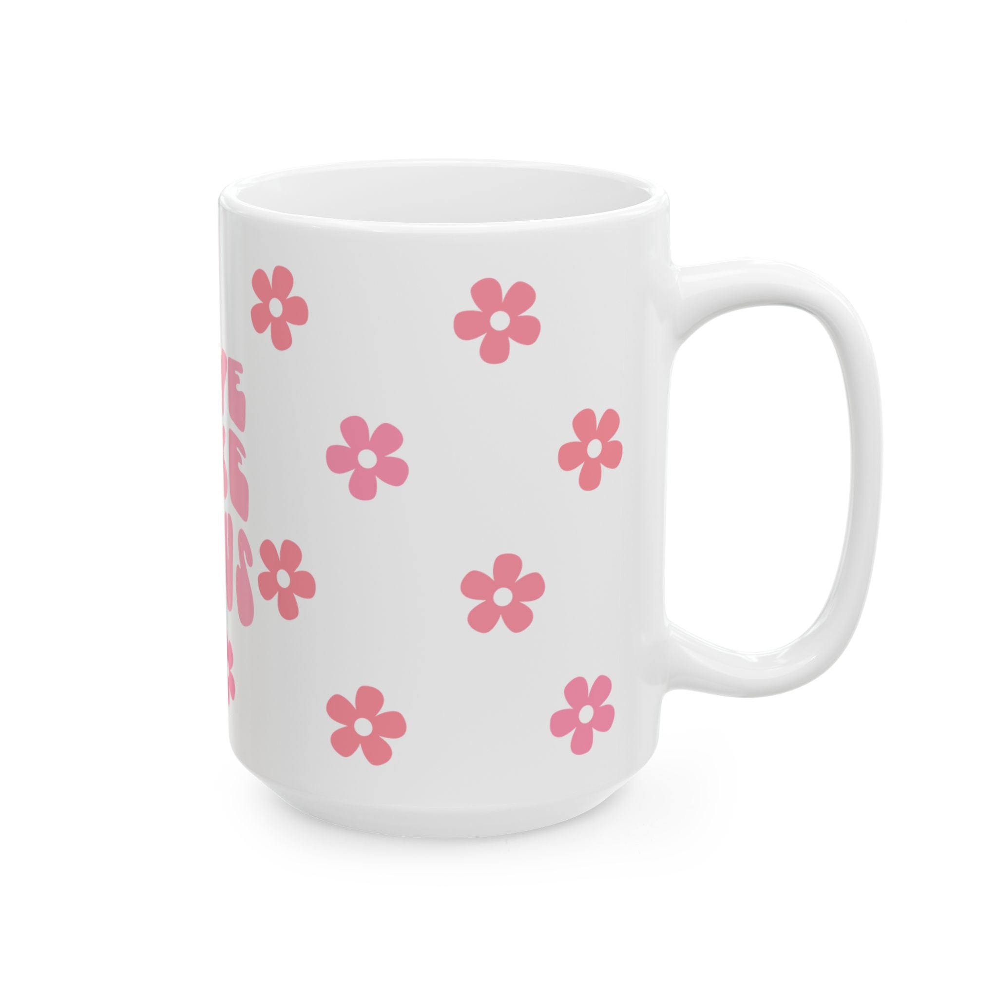 A cheerful ceramic mug that carries a gentle, faith-forward message in a playful, retro-inspired style. Soft pink lettering reads “Love Like Jesus” surrounded by scattered daisy-like flowers, creating a warm, uplifting vibe with a touch of nostalgia. The glossy white surface makes the pinks pop, turning an everyday ritual—coffee, tea, or cocoa—into a small moment of quiet encouragement. It sits comfortably in hand thanks to a rounded C-handle and comes in two sizes so you can choose the cup that fits your daily rhythm. This mug is microwave- and dishwasher-safe and made from durable, lead- and BPA-free ceramic for everyday use and long-lasting color.
