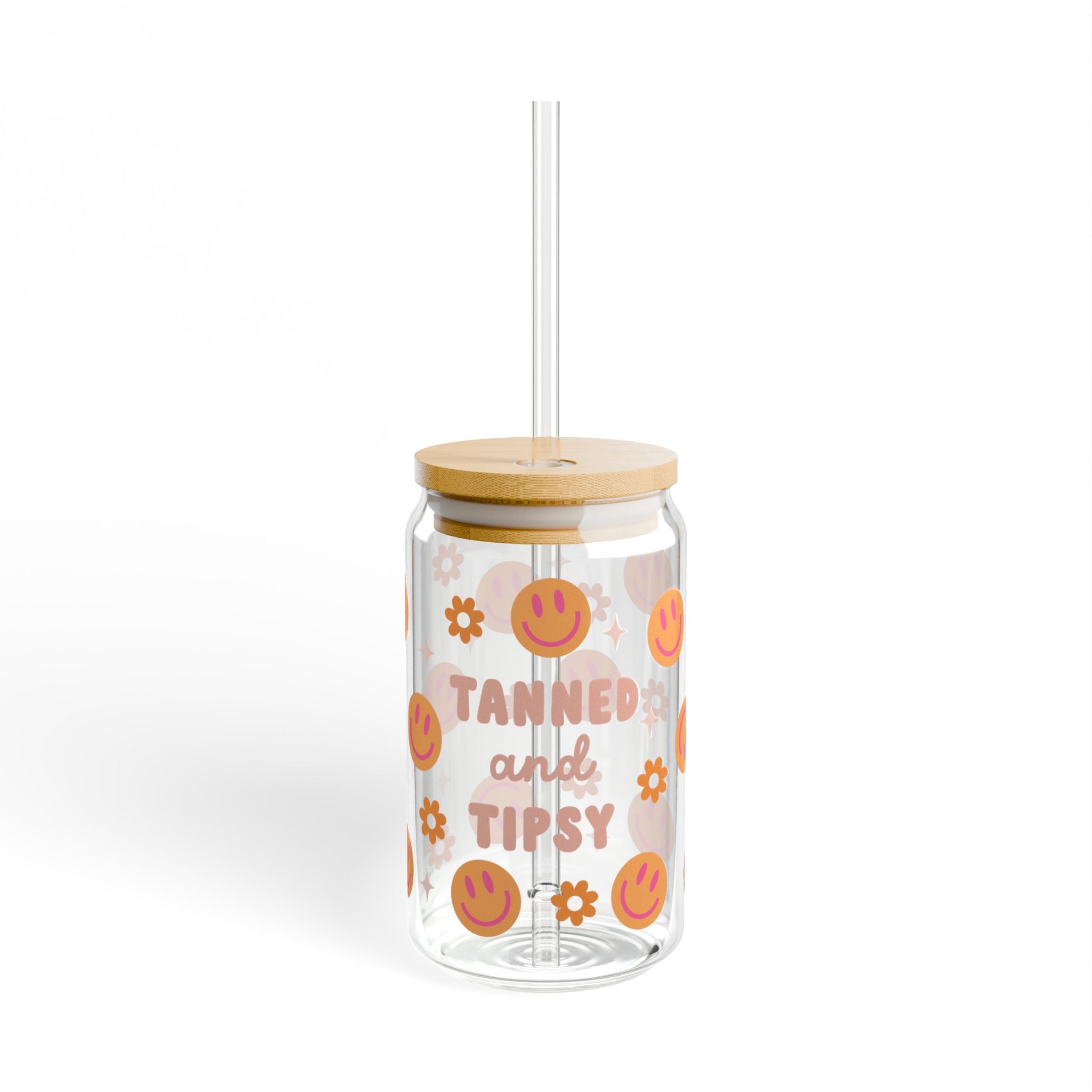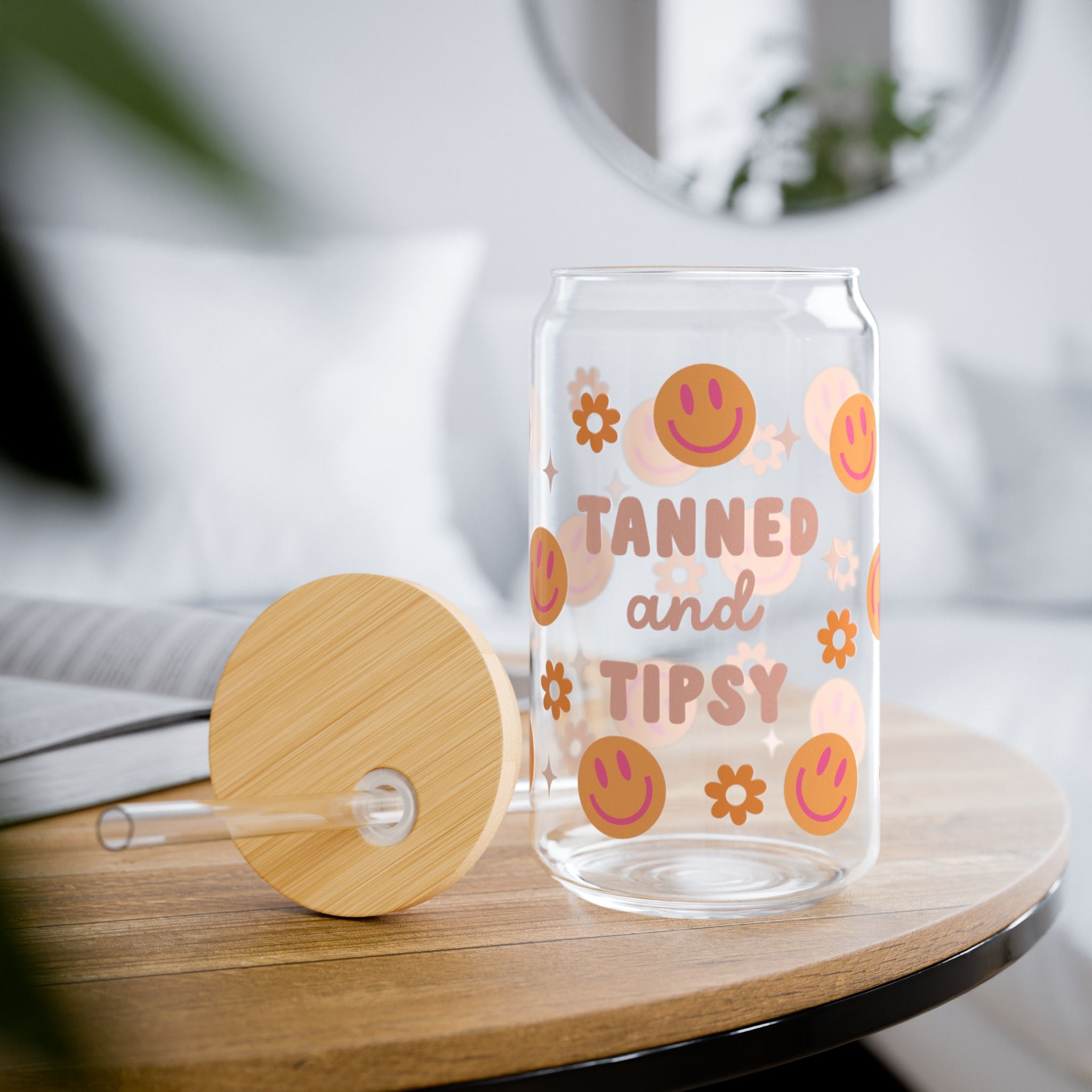 Tanned & Tipsy Tumbler Sipper Glass 16oz — Reusable Drink Jar with Lid & Straw