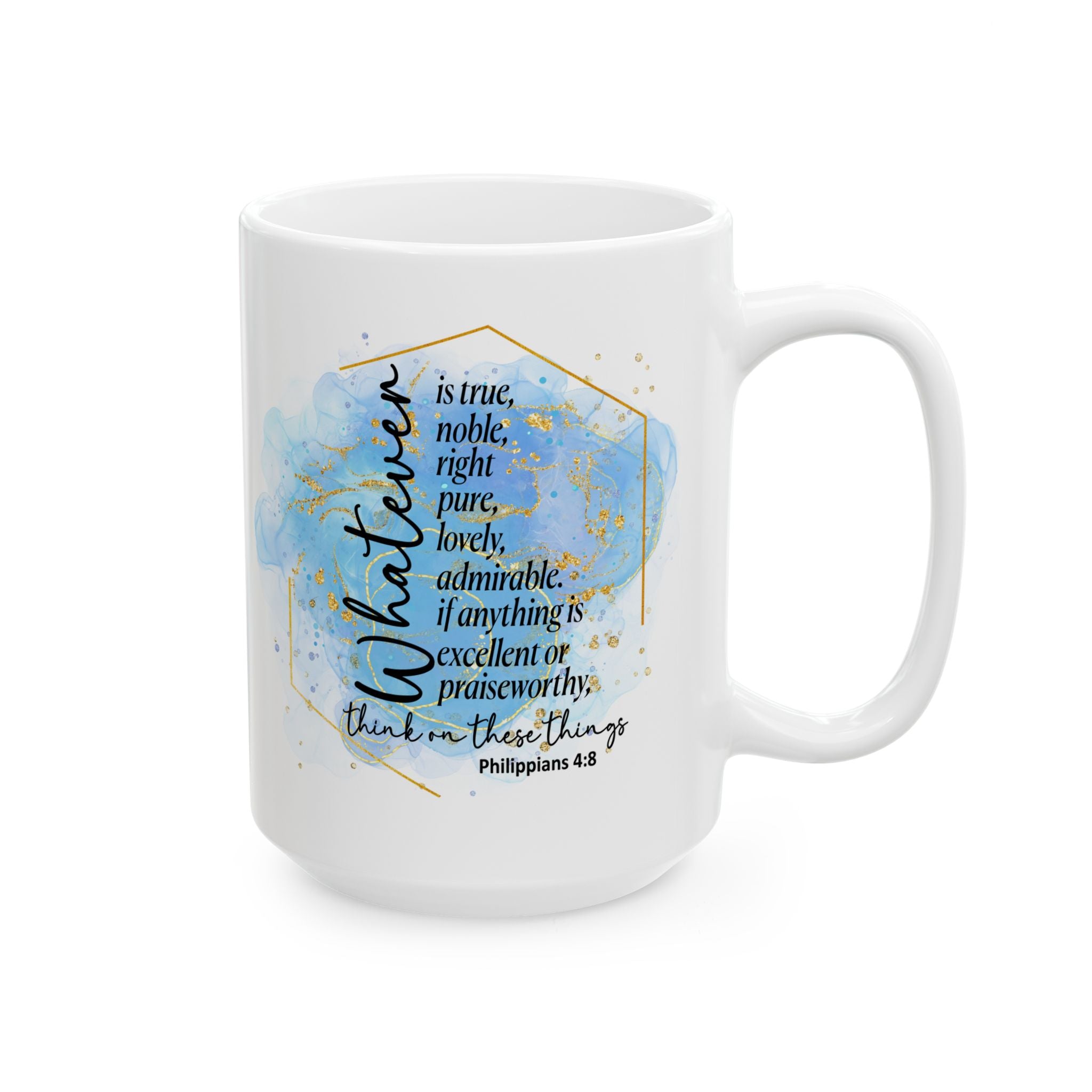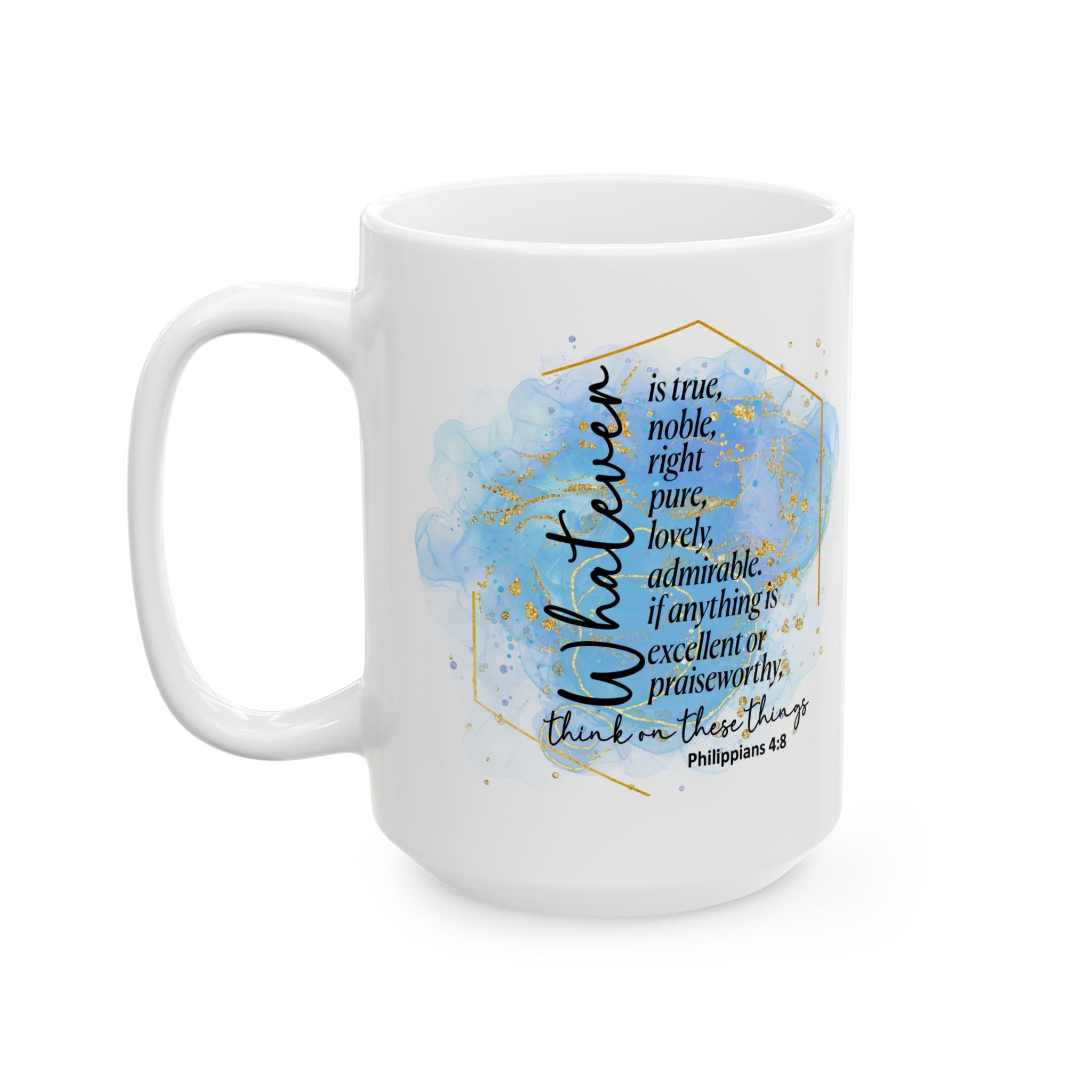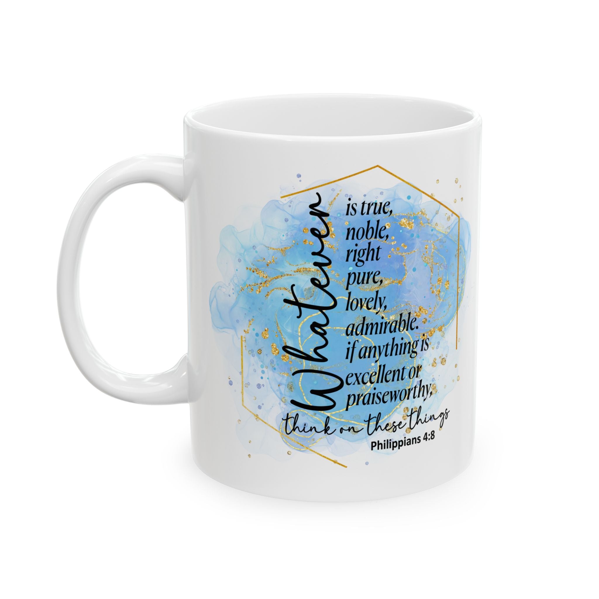 Think on These Things Philippians 4:8 Christian Mug — Blue Watercolor Coffee Cup (11oz, 15oz)