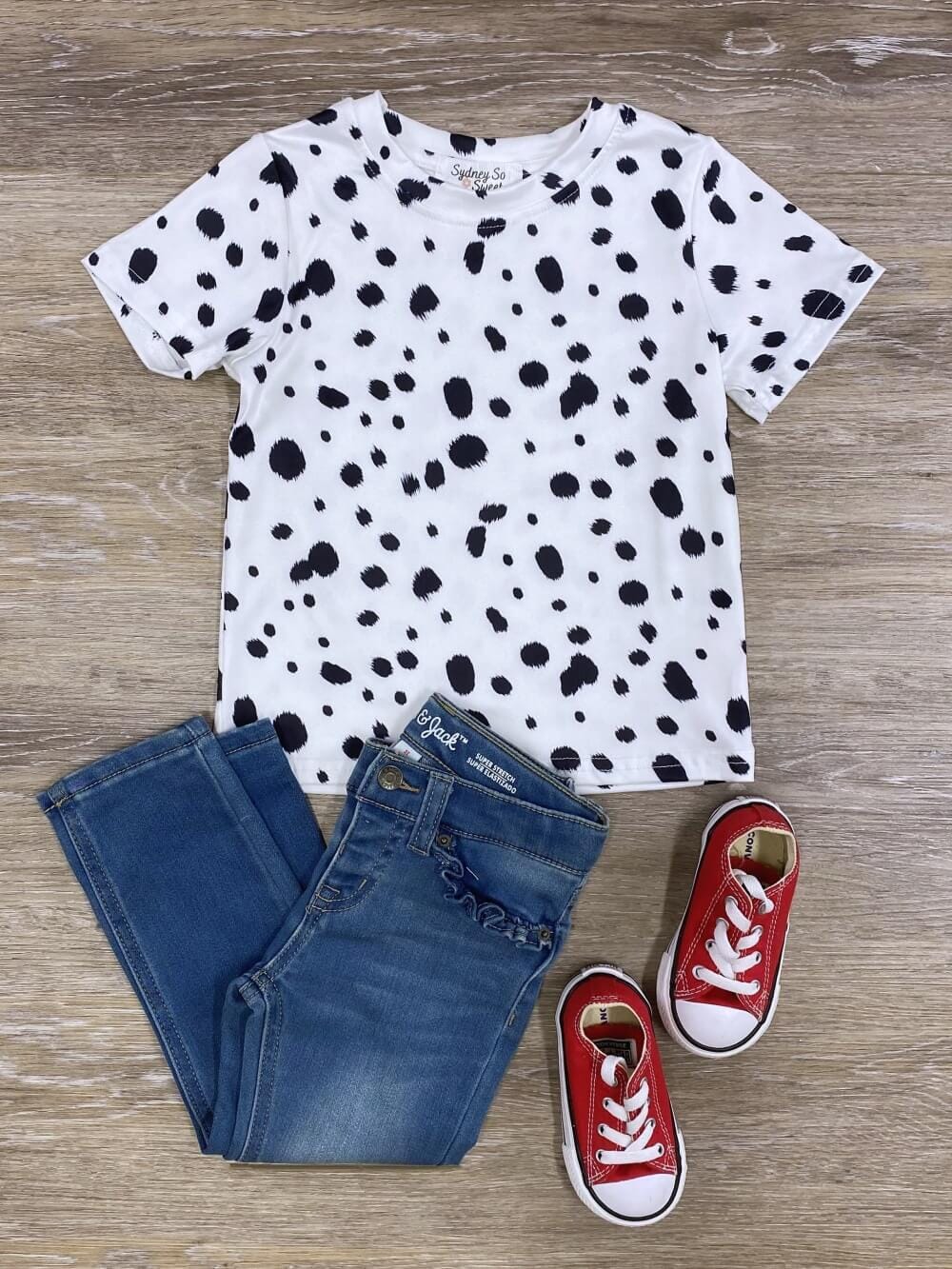 Our White & Black Dalmatian Costume T-Shirt for boys and girls is perfect for playful dress-up or Halloween fun. Featuring an all-over black and white Dalmatian spot design, this comfy short sleeve shirt is easy to pair with pants or a tutu for a complete look. Ideal for little ones who love to channel their inner puppy!